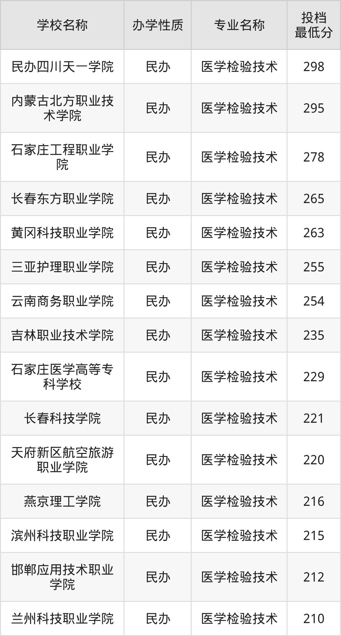 一般来说,医学检验技术都需要210分以上才能被录取,当然分数线因省份、科类而不同。从河北省2025年的招录数据来看,2025年医学检验技术专业最低分是210分,而河北省专科线是200分,意味着考生至少需超过专科线10分才能上。