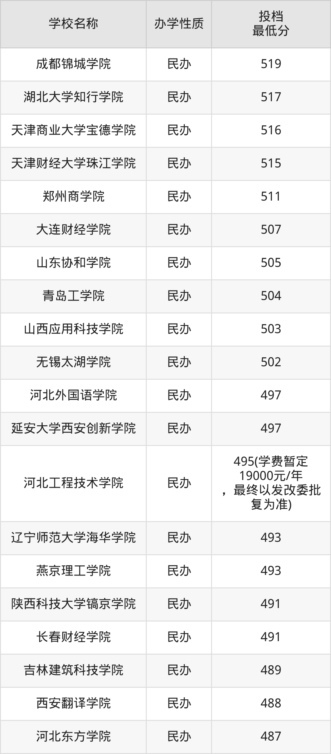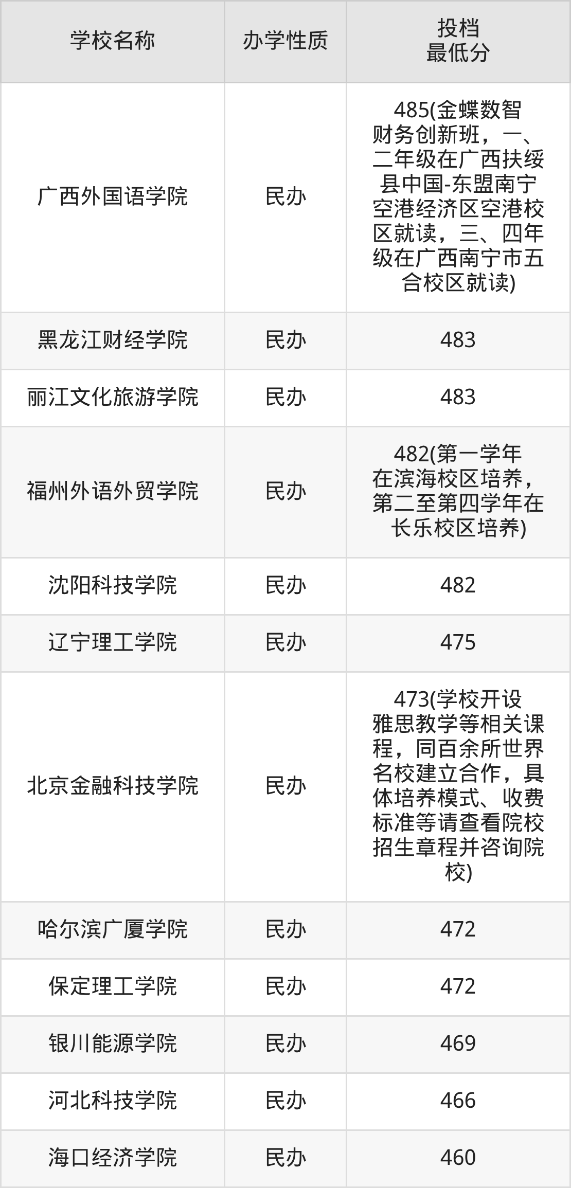 另外分数线比较低的大学还有河北科技学院(466分)、银川能源学院(469分)、保定理工学院(472分)、哈尔滨广厦学院(472分)、北京金融科技学院(473分)等。