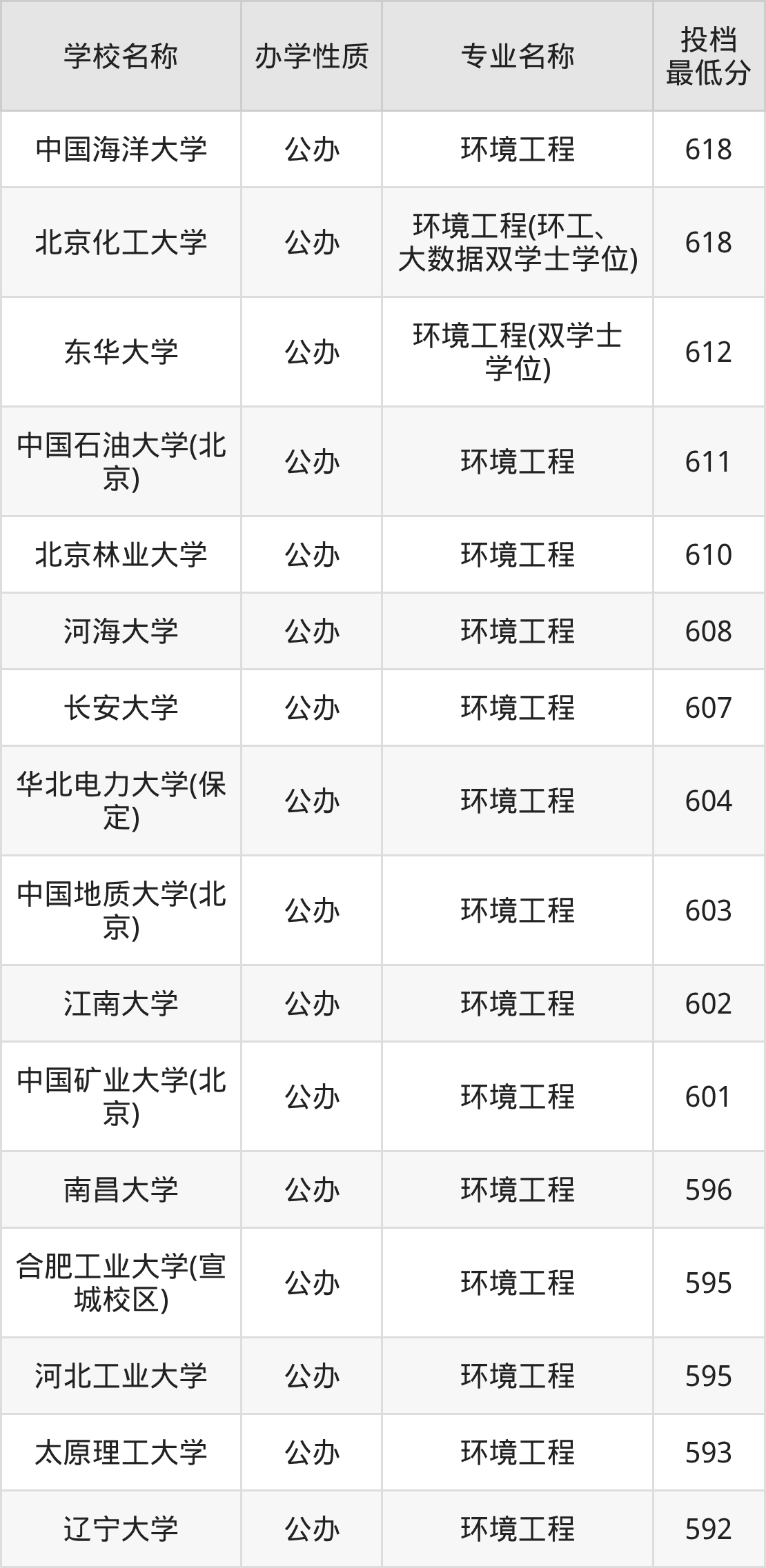 600分左右的环境工程大学有:北京化工大学618分、中国海洋大学618分、东华大学612分、中国石油大学(北京)611分、北京林业大学610分。
