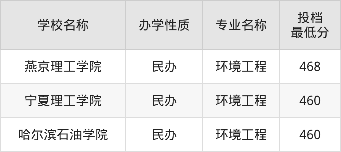 450分左右的环境工程大学有:燕京理工学院468分、哈尔滨石油学院460分、宁夏理工学院460分。