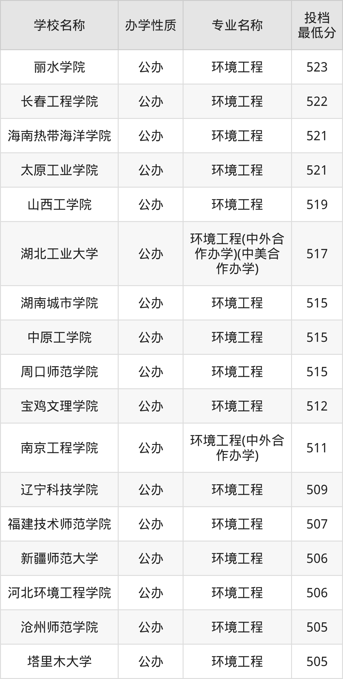 500分左右的环境工程大学有:山西工学院519分、湖北工业大学517分、湖南城市学院515分、中原工学院515分、周口师范学院515分。