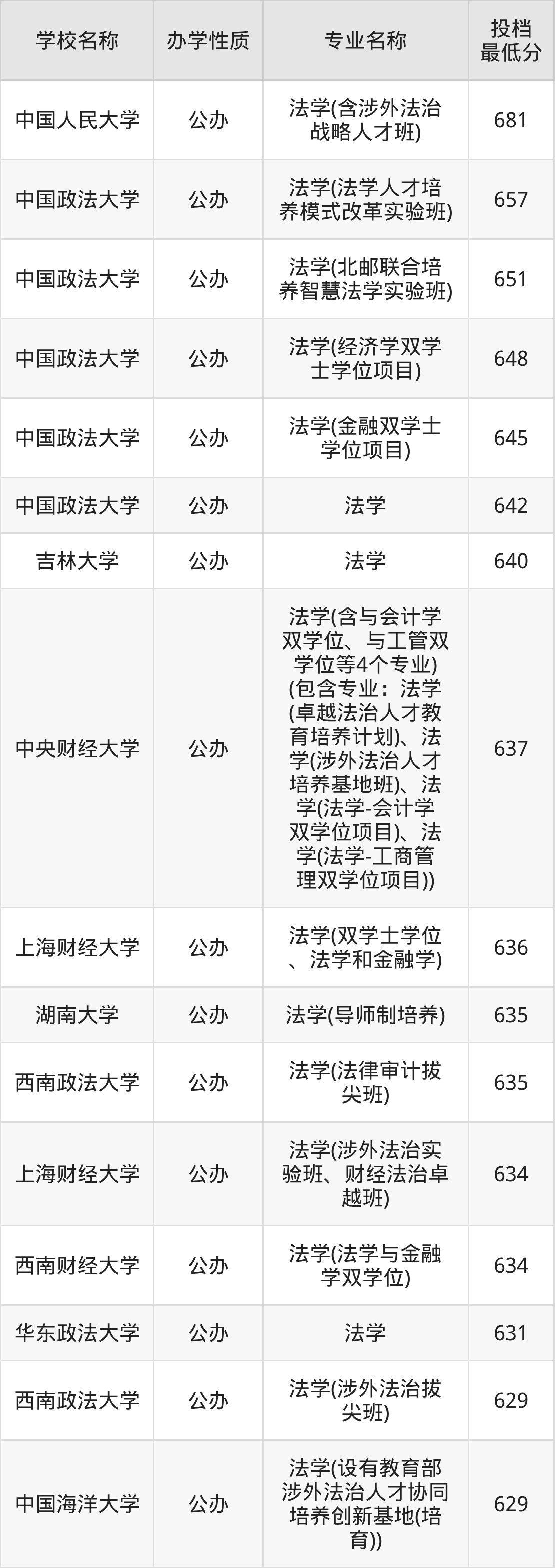 法学专业最好的50所大学名单如表中所示,考生可以结合上文整理的分数线,然后根据自己的成绩选择合适的学校报考。