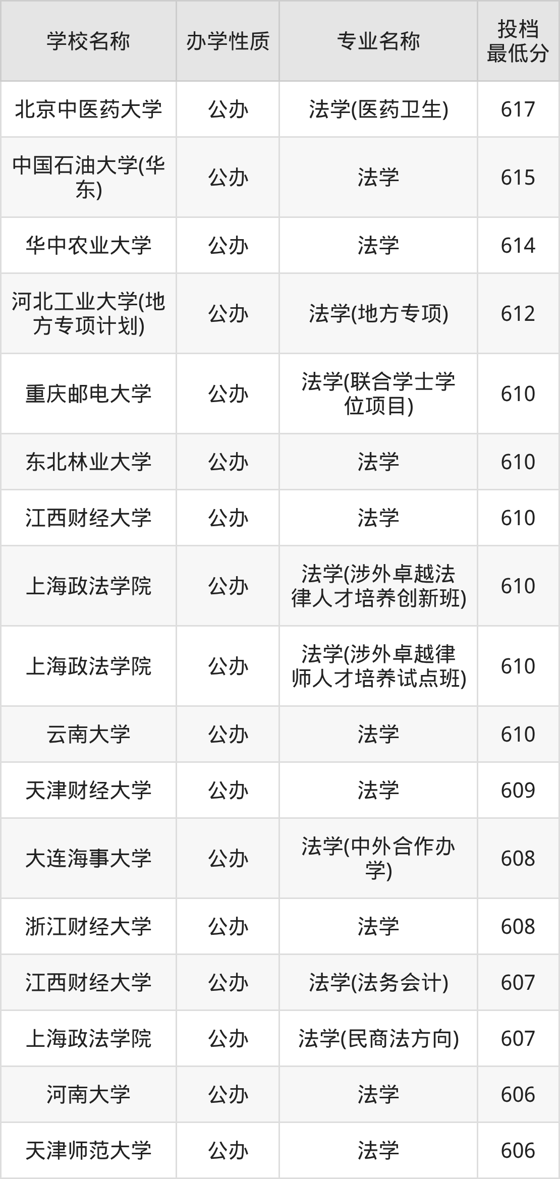 下面是2025年全国所有大学法学专业录取分数线一览表(按照分数线从高到低排名):