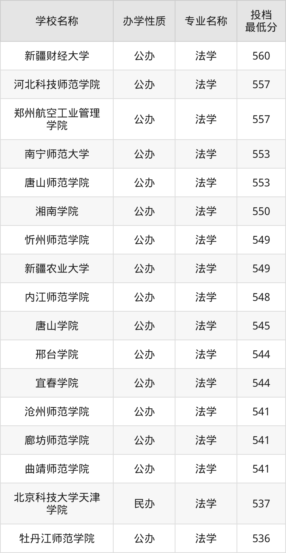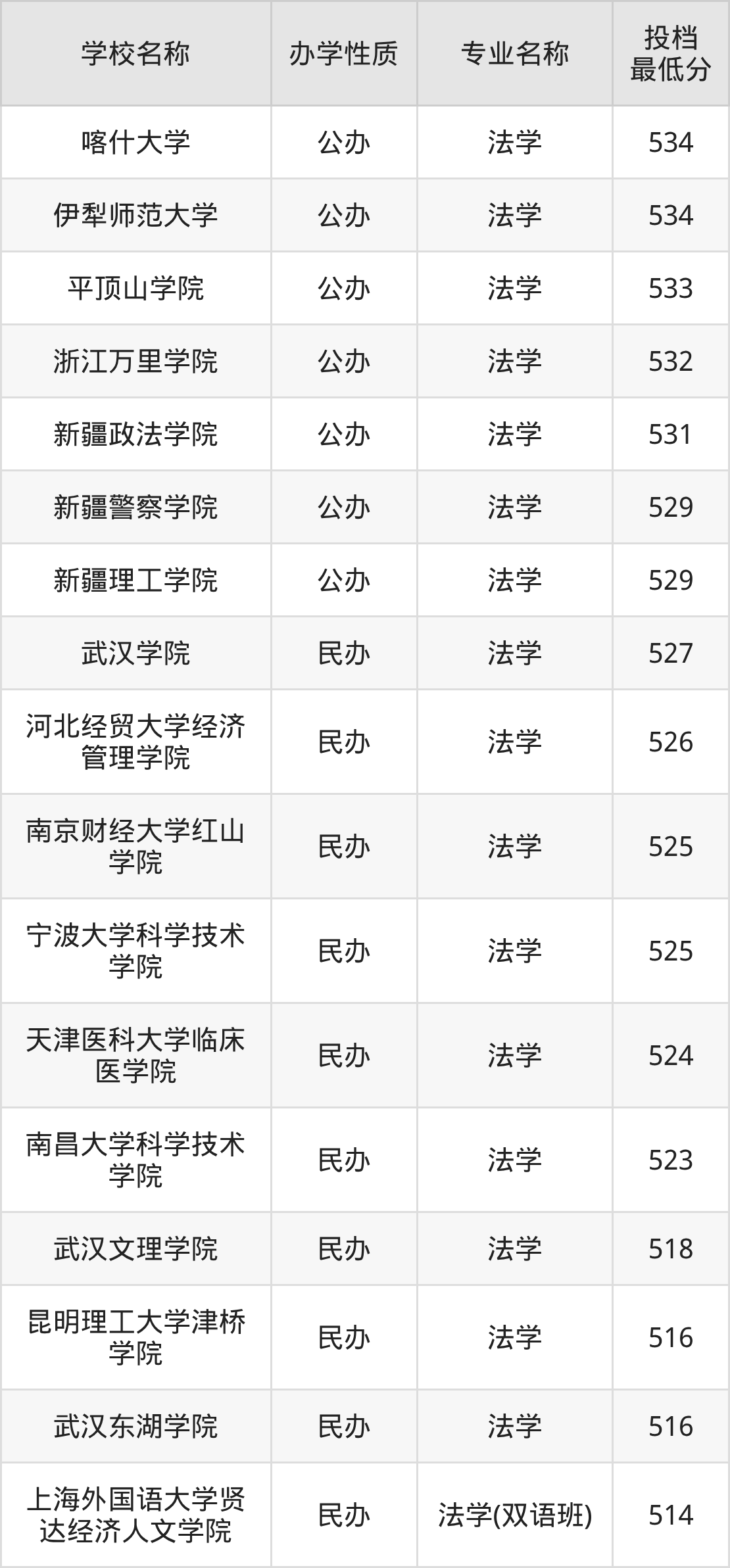 法学专业收分最低的公办大学是新疆警察学院,2025年最低分529分,超本科线70分。可见法学专业的招生门槛是非常高的,如果想要上一所公办本科大学的法学专业,至少需要过本科线70分及以上。