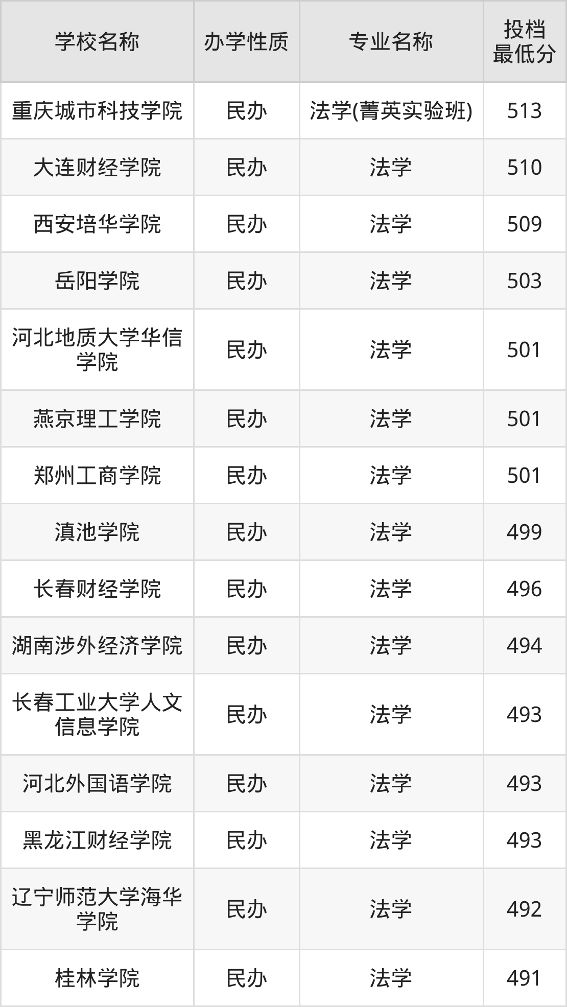 500分左右的法学大学:郑州工商学院501分、燕京理工学院501分、河北地质大学华信学院501分、岳阳学院503分、西安培华学院509分等;