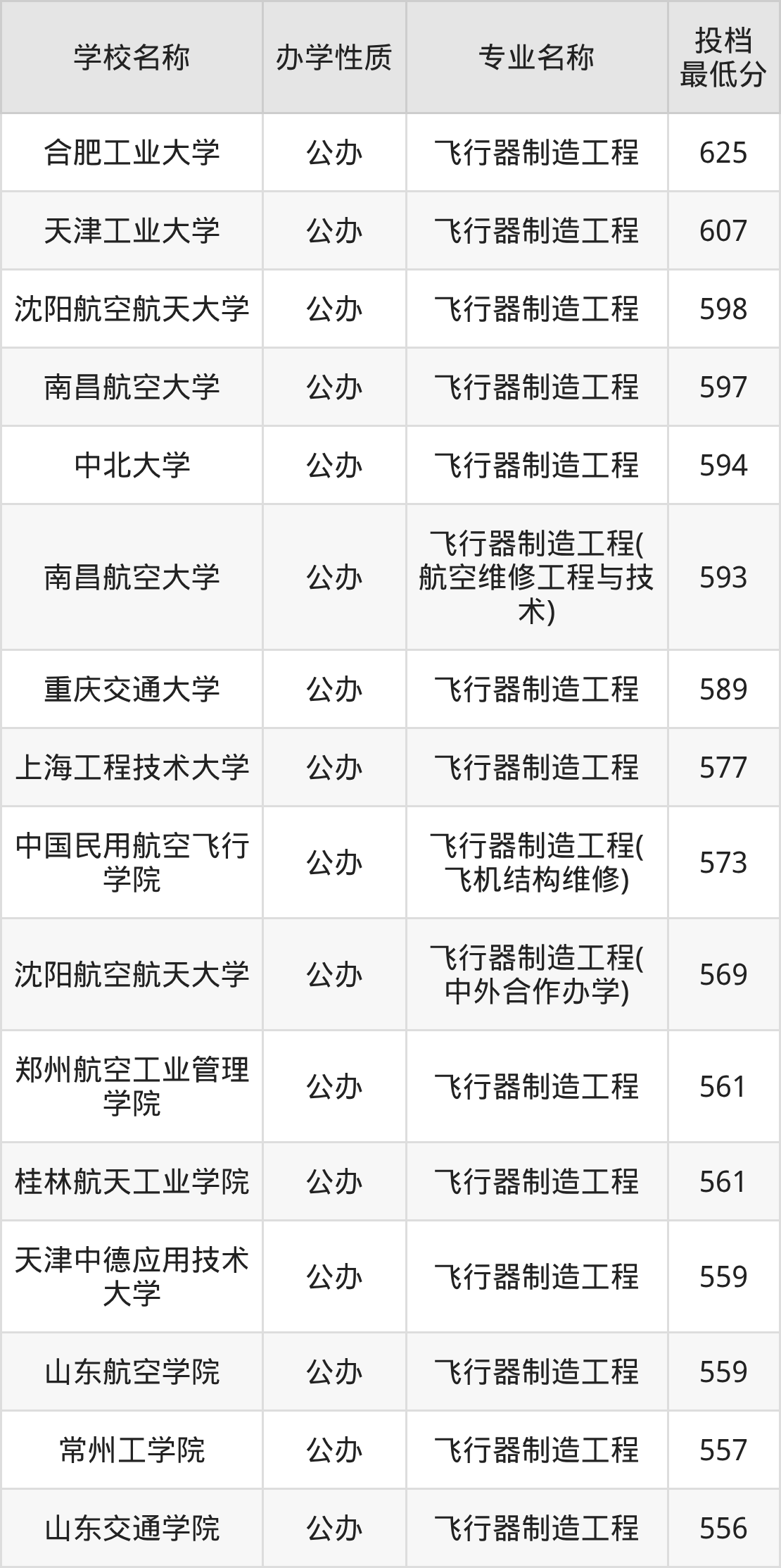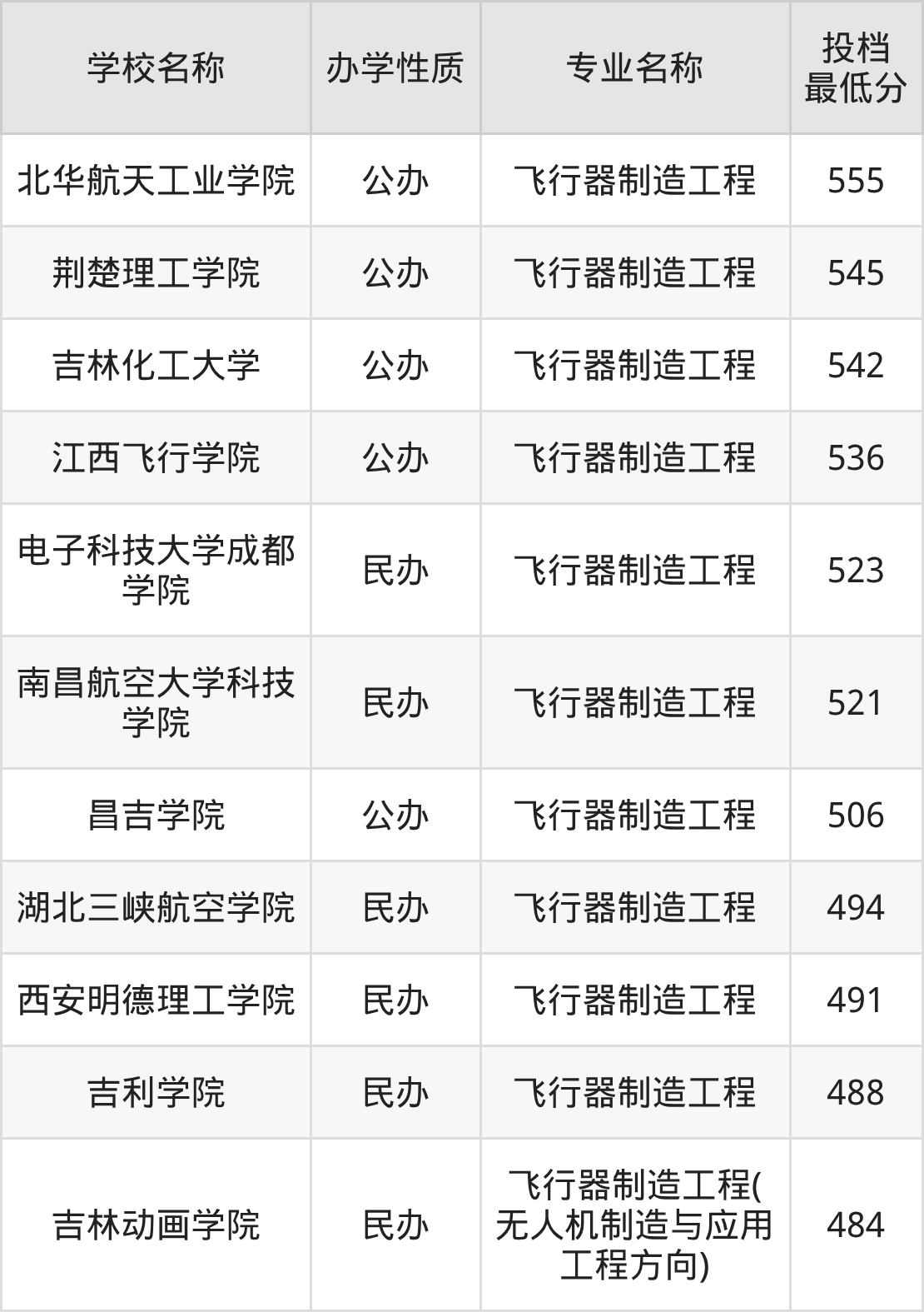500分左右的飞行器制造工程大学:昌吉学院506分、南昌航空大学科技学院521分、电子科技大学成都学院523分、江西飞行学院536分、吉林化工大学542分等;