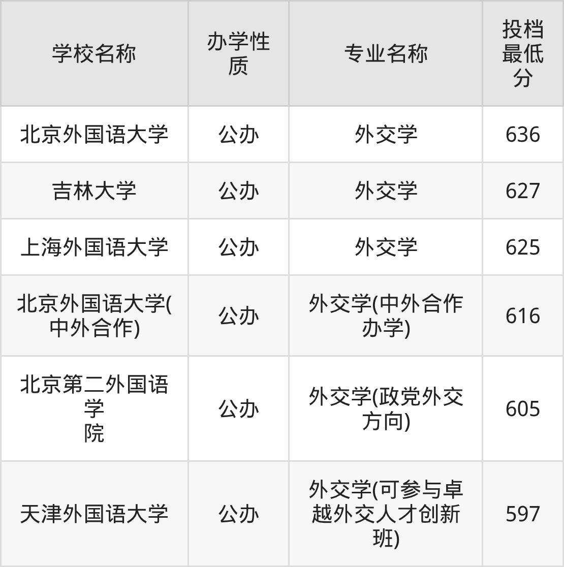 600分左右的外交学大学有:北京外国语大学(中外合作)616分、北京第二外国语学院605分、天津外国语大学597分。