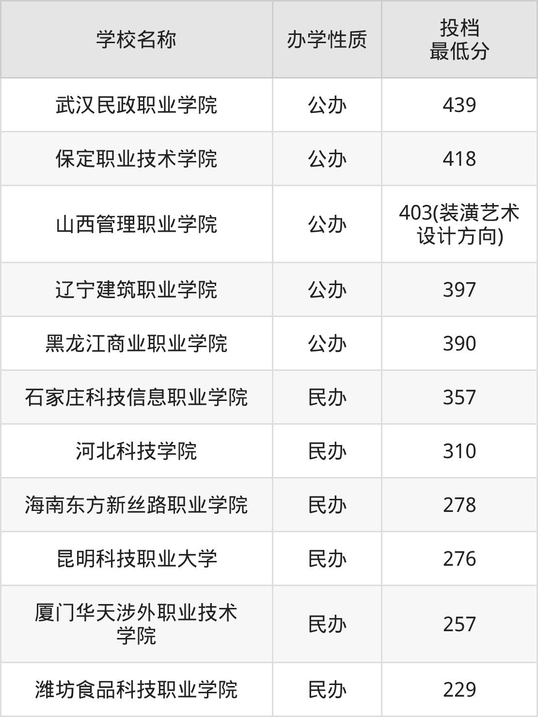 视觉传达设计专业收分最高的大学是武汉民政职业学院,2025年最低分439分,超专科线339分。分数线排名前五的大学还有:保定职业技术学院418分、山西管理职业学院(装潢艺术设计方向)403分、辽宁建筑职业学院397分、黑龙江商业职业学院390分。