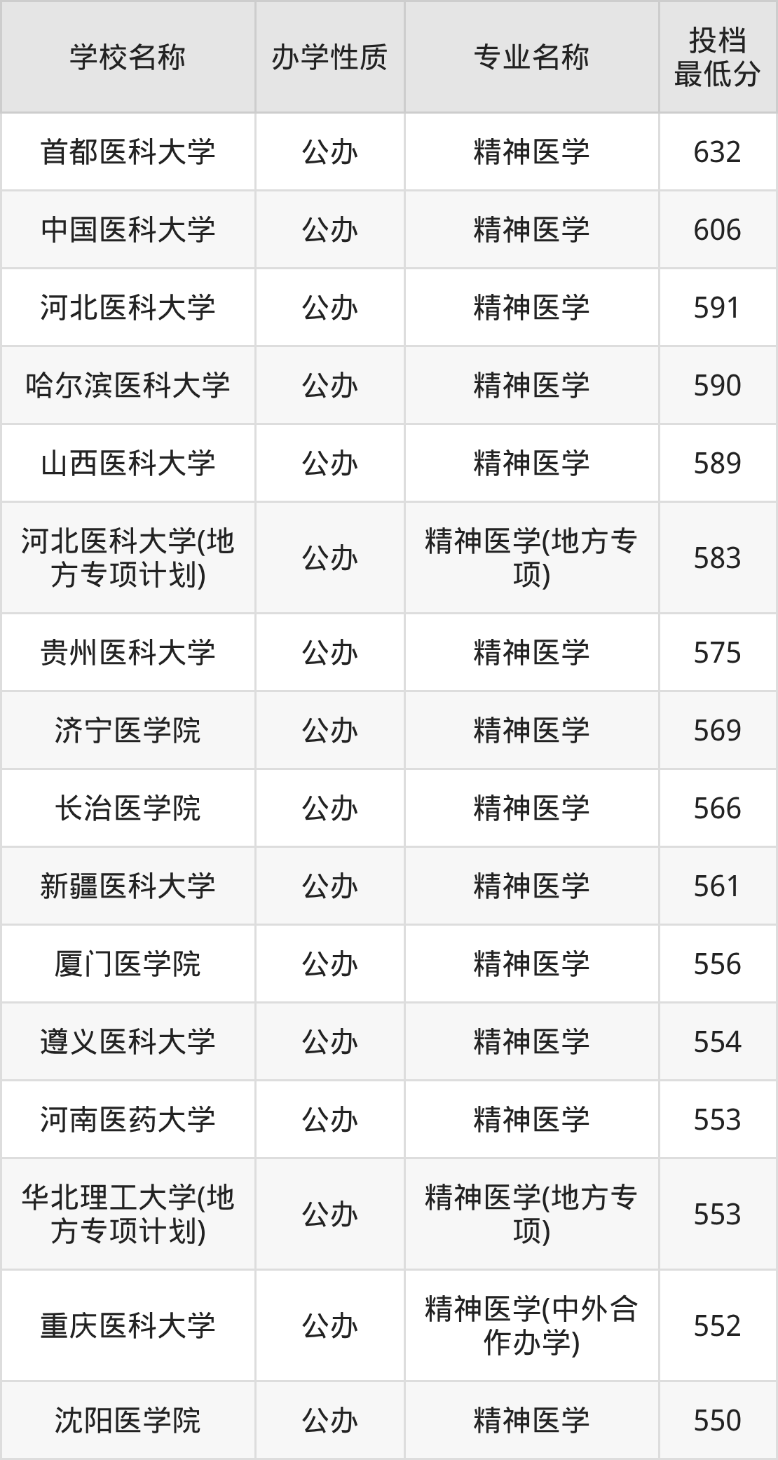 下面是全国各个大学精神医学专业最低录取分数线排名一览表,考生可根据自己的分数情况选择合适的学校报考。