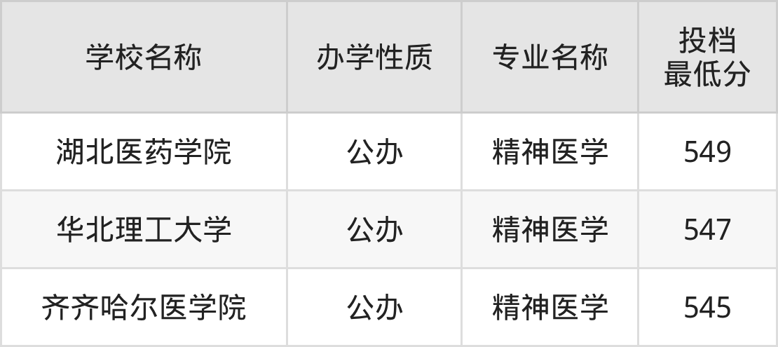 分数线最低、最好考的是齐齐哈尔医学院,学校精神医学最低分是545,超本科线86分,该校也是同学们最容易考上的公办大学。