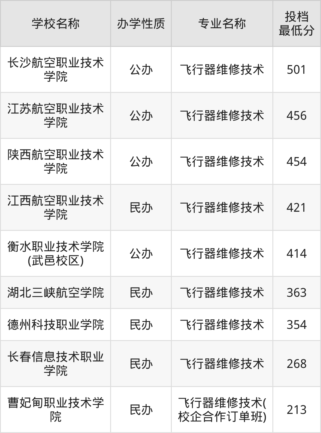 2025年全国飞行器维修技术专业录取分数线从213分到501分不等,各校最低分数线存在较大差异。