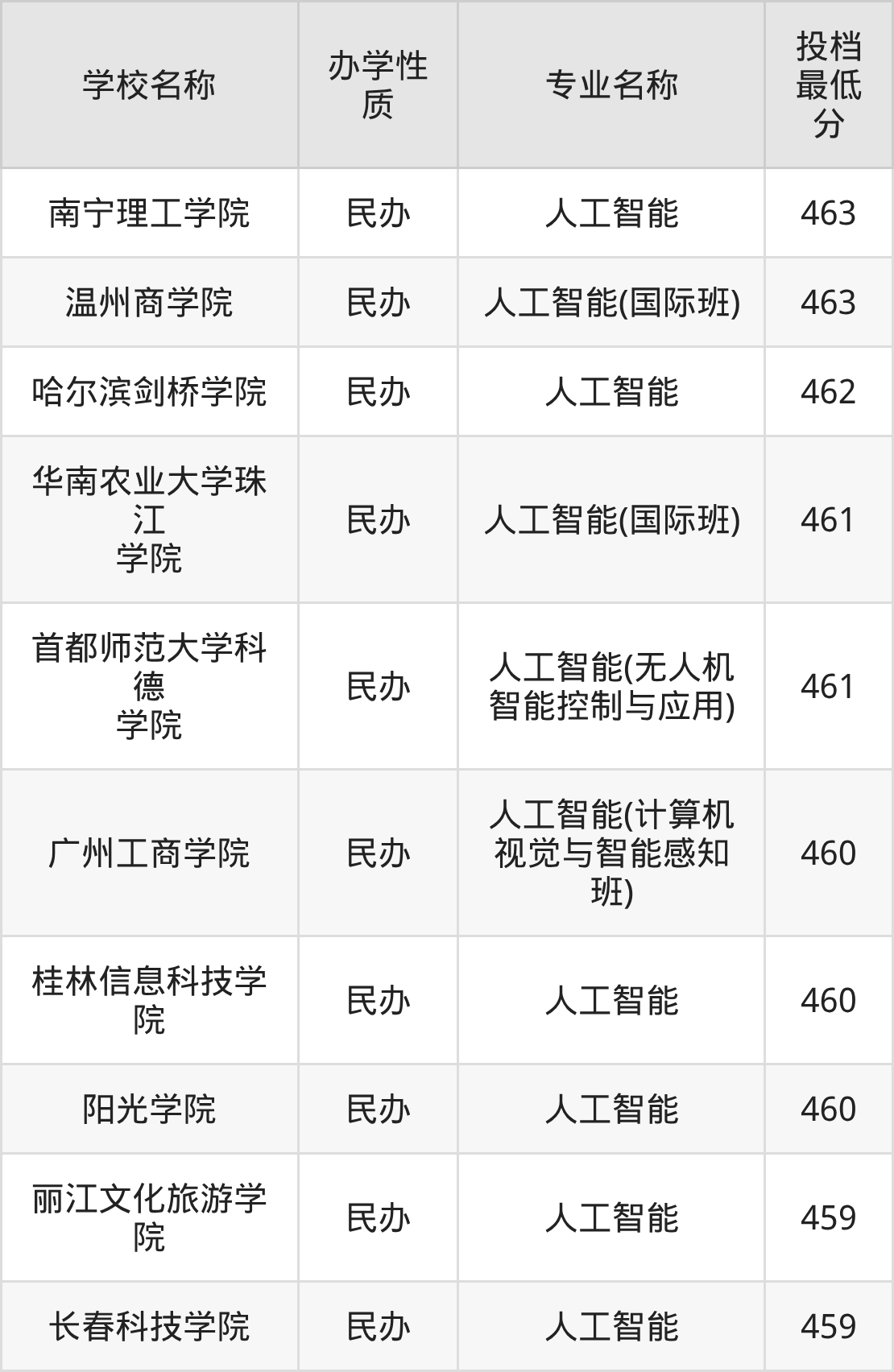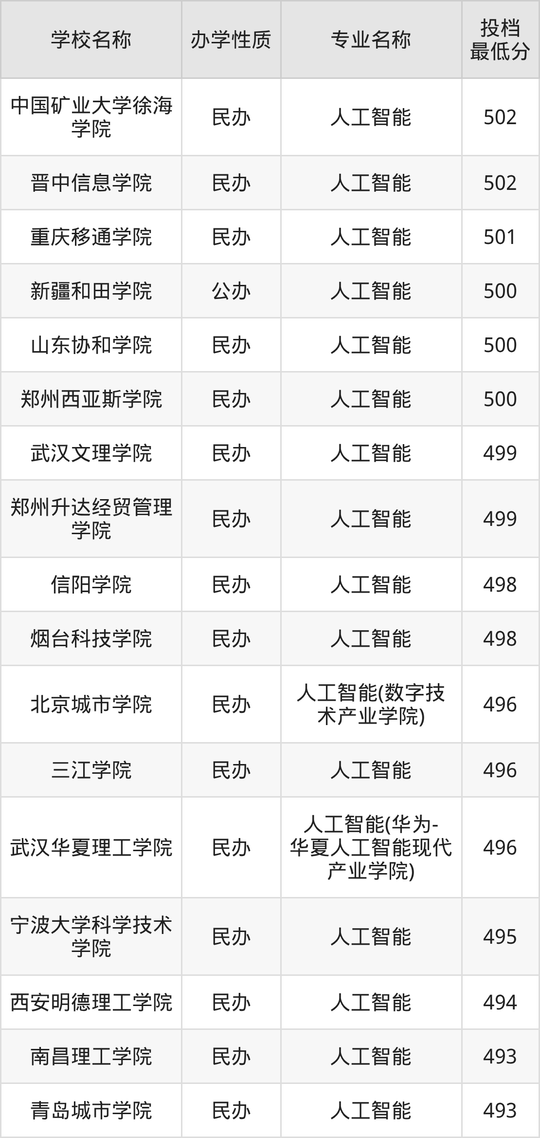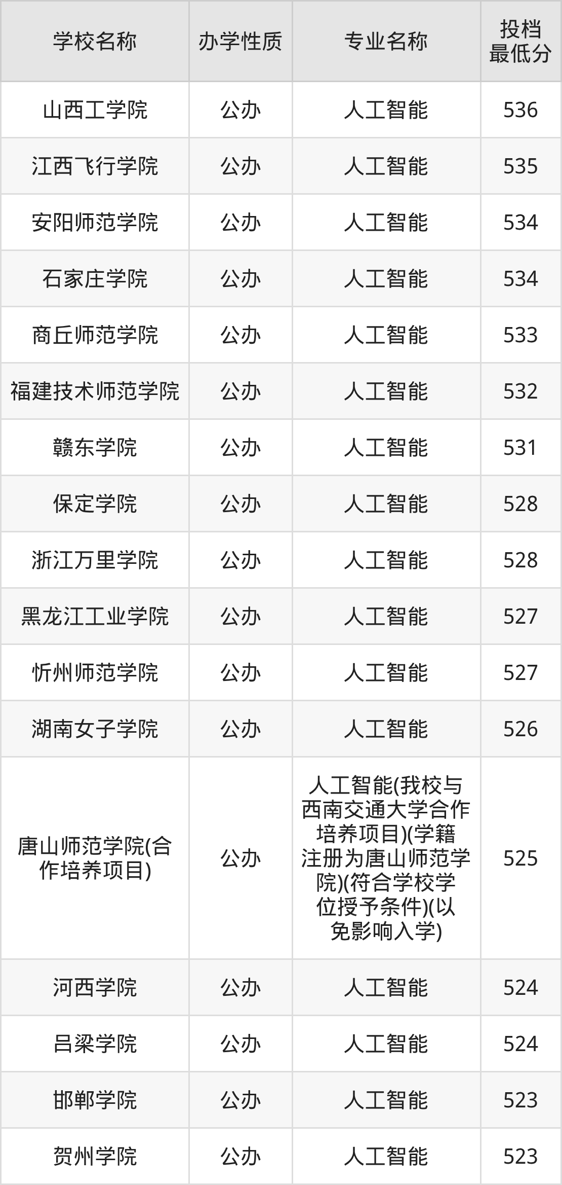 分数线最低、最好考的是丽江文化旅游学院,学校人工智能最低分是459,超本科线0分,不过这所学校是民办性质。2025公办大学最低分是500,收分最低的学校是新疆和田学院,超本科线41分能上。