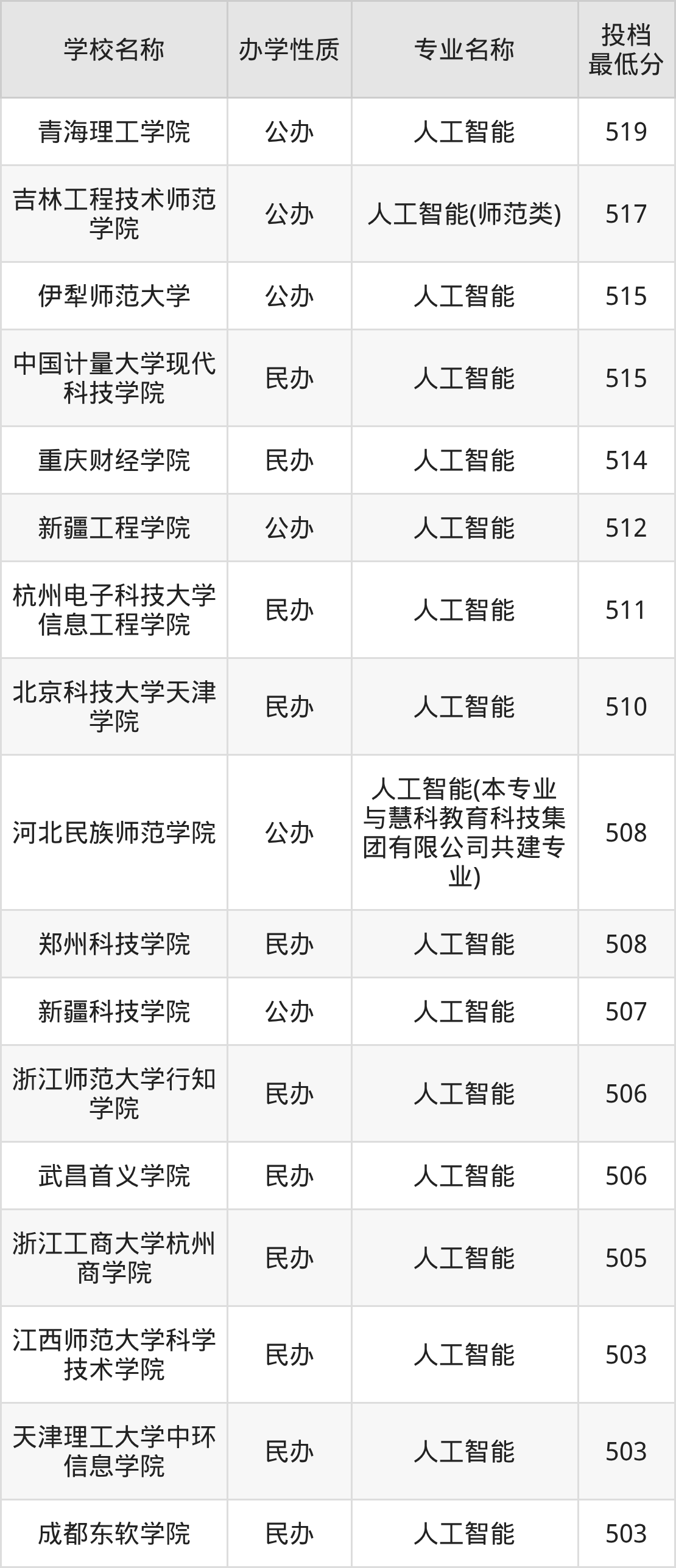 500分左右的人工智能大学有:青海理工学院519分、吉林工程技术师范学院517分、伊犁师范大学515分、中国计量大学现代科技学院515分、重庆财经学院514分。