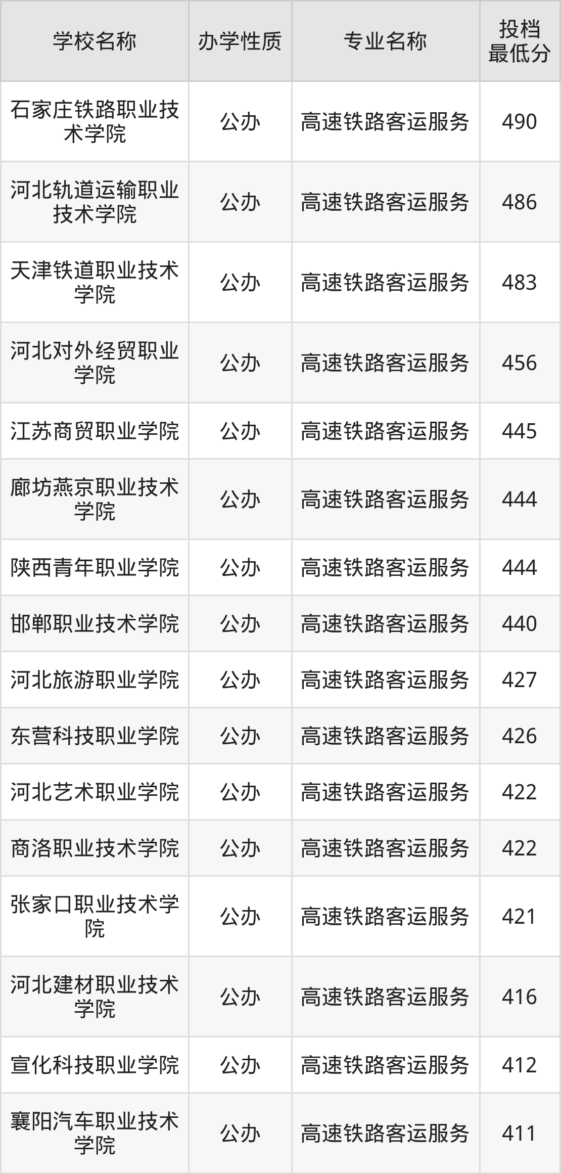 2025年高速铁路客运服务专业最低录取分数线位于203分到490分之间,收分最低的大学是石家庄工程职业学院。各校最低分如下。
