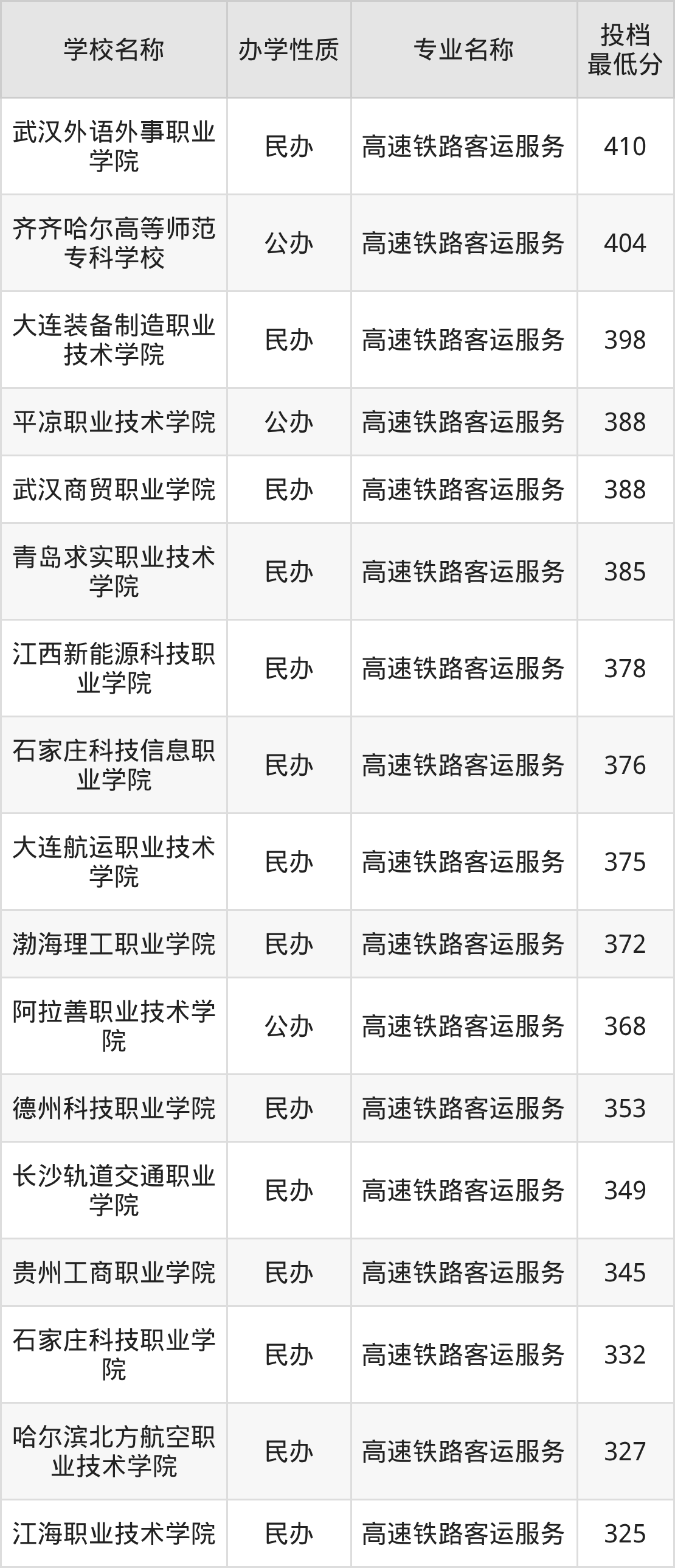 高速铁路客运服务专业收分最低的公办大学是阿拉善职业技术学院,2025年最低分368分,超专科线168分。可见高速铁路客运服务专业的招生门槛是非常高的,如果想要上一所公办专科大学的高速铁路客运服务专业,至少需要过专科线168分及以上。