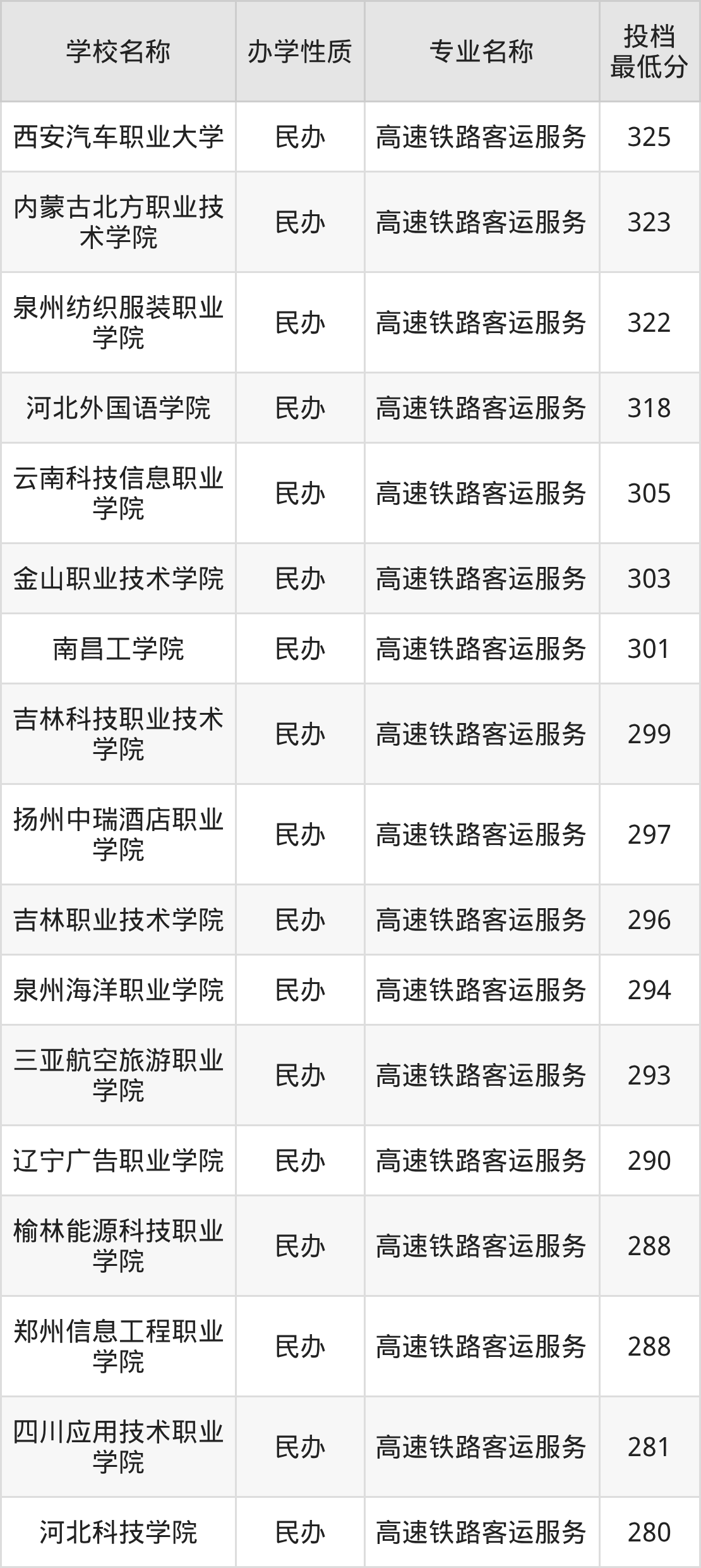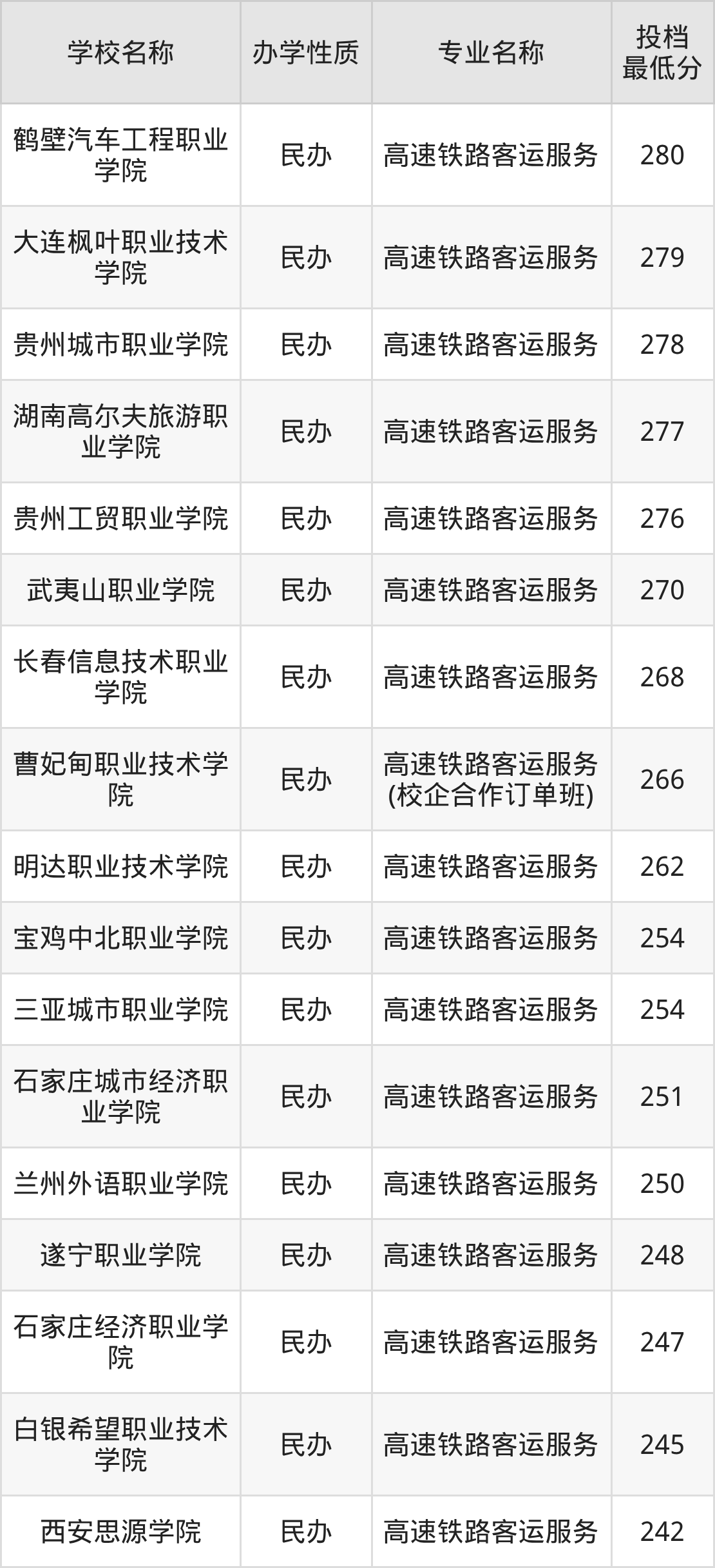 下面是2025年全国所有大学高速铁路客运服务专业录取分数线一览表(按照分数线从高到低排名):