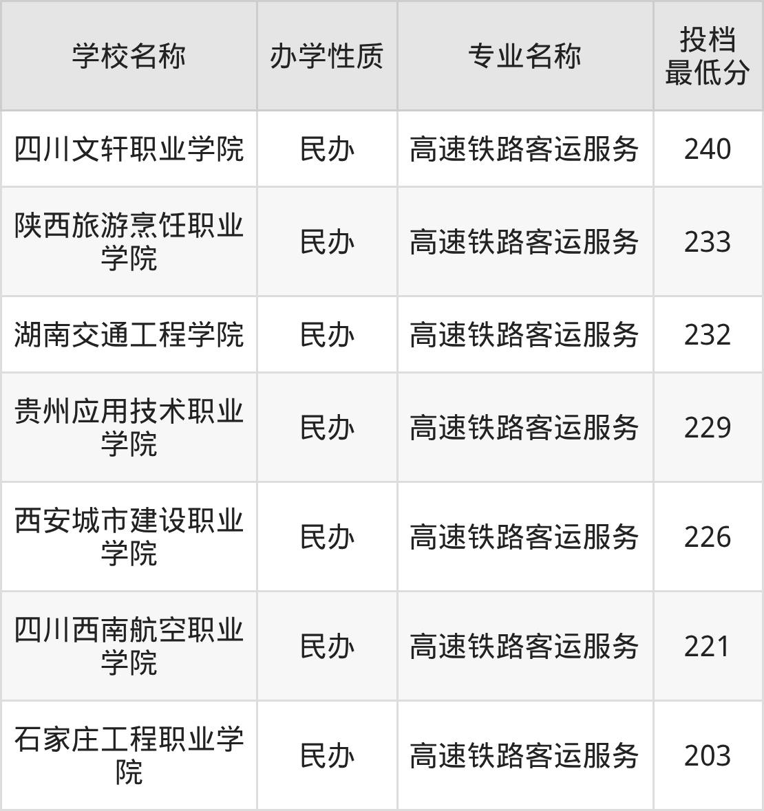 2025年高速铁路客运服务专业最低录取分数线是203分,超专科分数线(200分)3分。也就是说想报考高速铁路客运服务专业的同学,至少得超过专科线3分及以上。高速铁路客运服务专业最低分的大学是石家庄工程职业学院,不过该校属于民办。