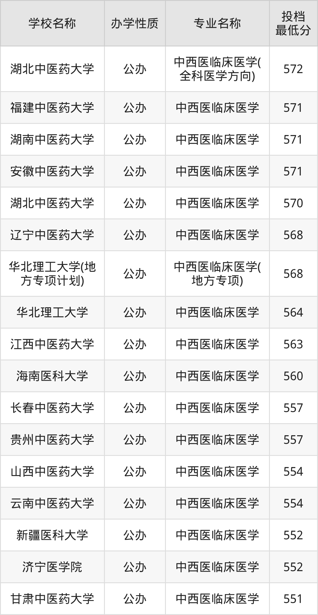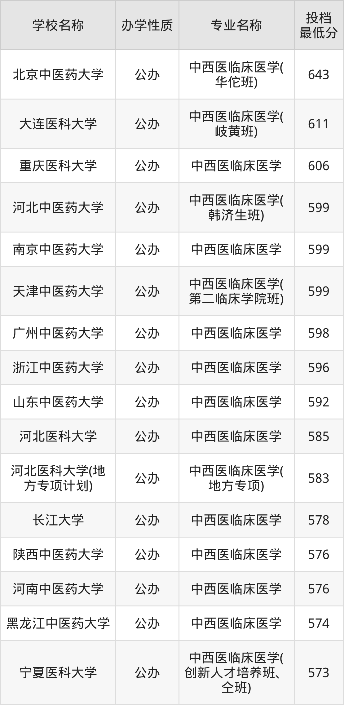 下面是全国各个大学中西医临床医学专业最低录取分数线排名一览表,考生可根据自己的分数情况选择合适的学校报考。