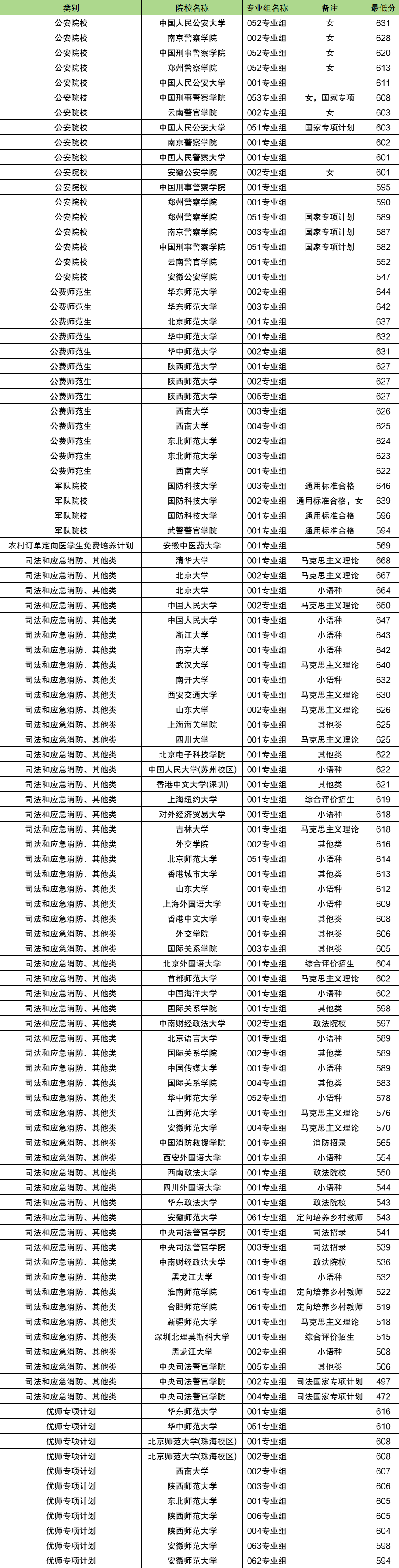 公安院校547分、公费师范生632分、军队院校579分、农村订单定向医学生免费培养计划556分、司法和应急消防其他类468分、优师专项计划602分。