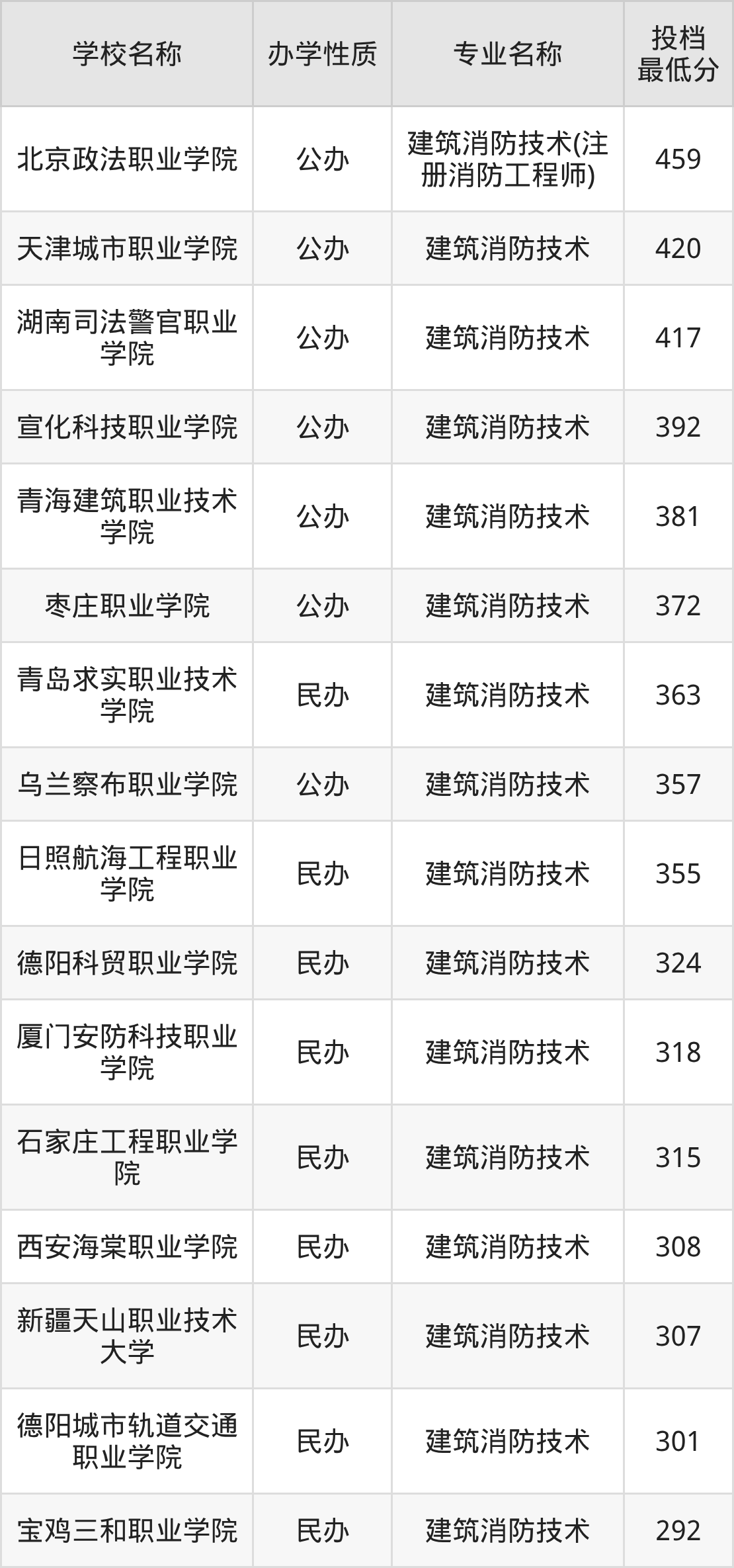 450分左右的建筑消防技术大学有:北京政法职业学院459分。