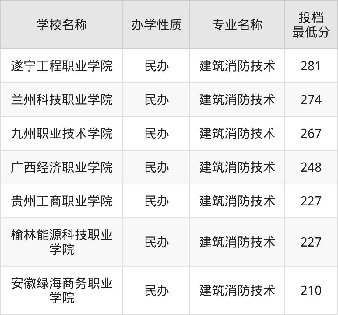 一般来说,建筑消防技术都需要210分以上才能被录取,当然分数线因省份、科类而不同。从河北省2025年的招录数据来看,2025年建筑消防技术专业最低分是210分,而河北省专科线是200分,意味着考生至少需超过专科线10分才能上。