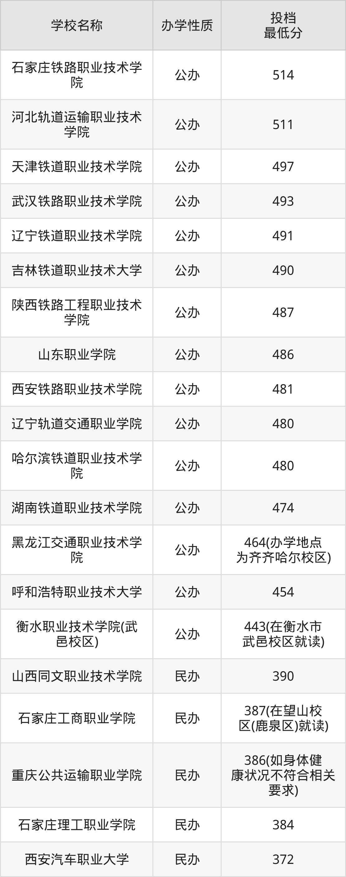 分数线第一名是:石家庄铁路职业技术学院,514分。