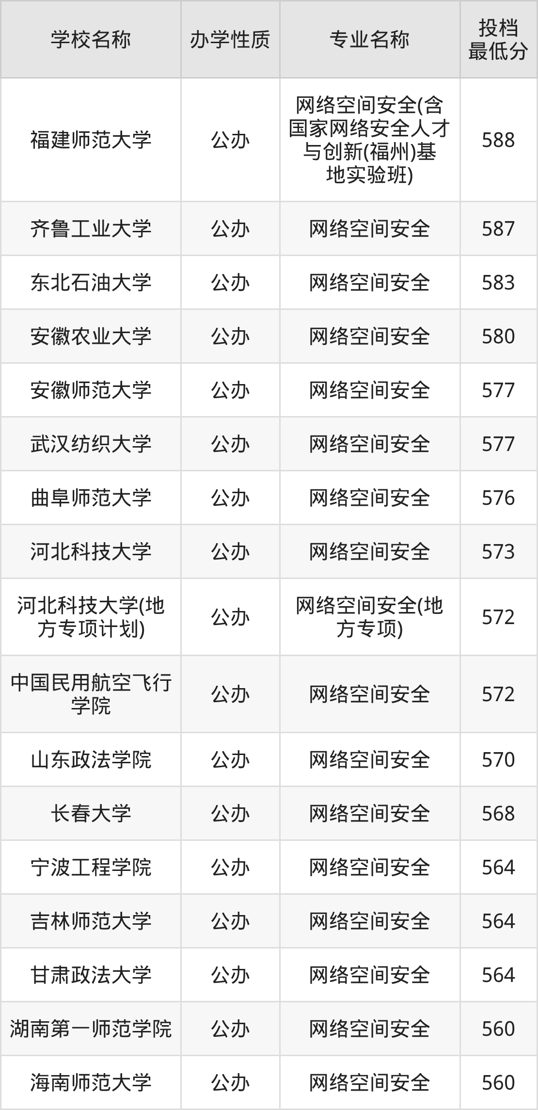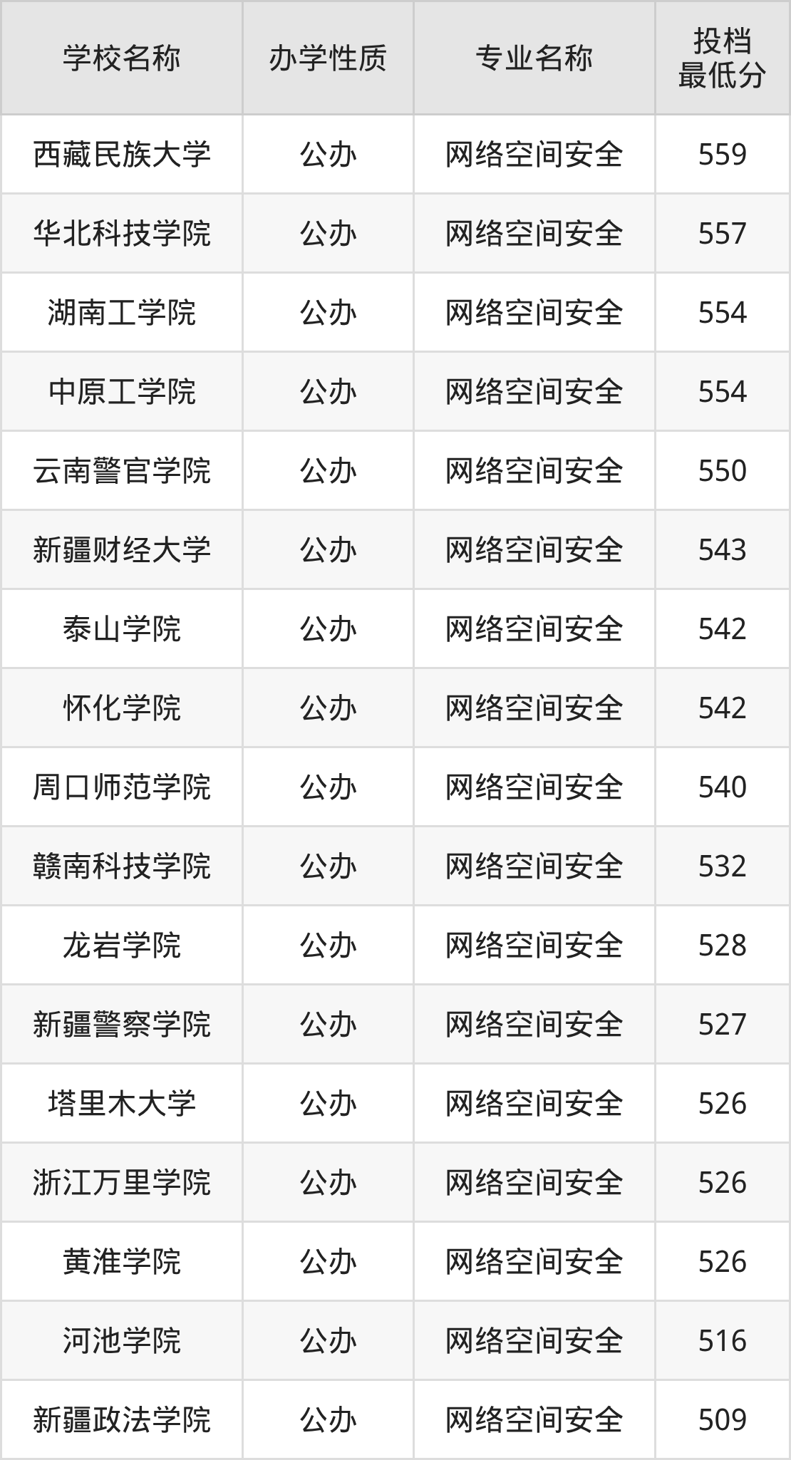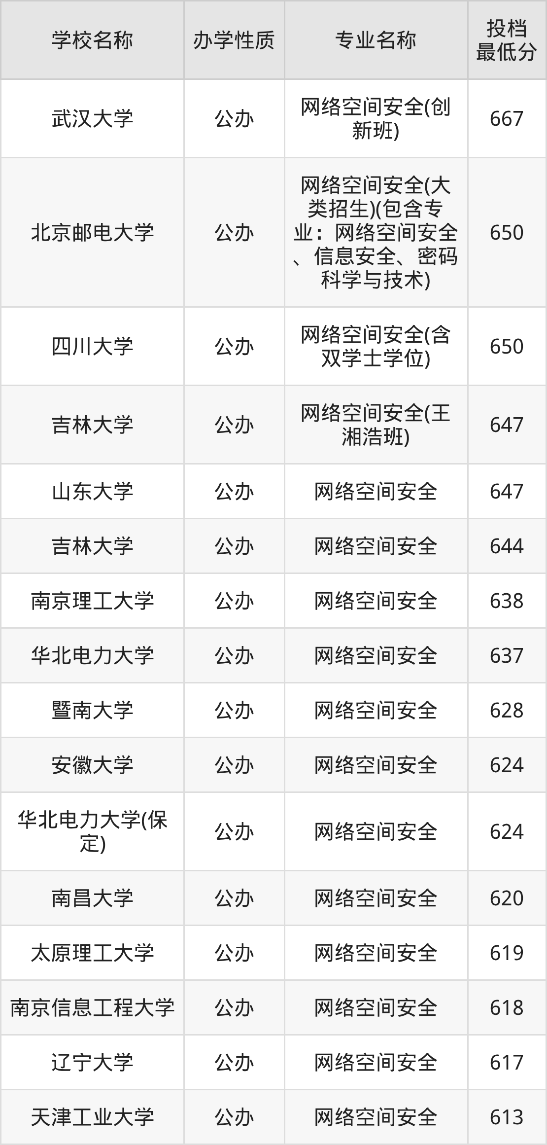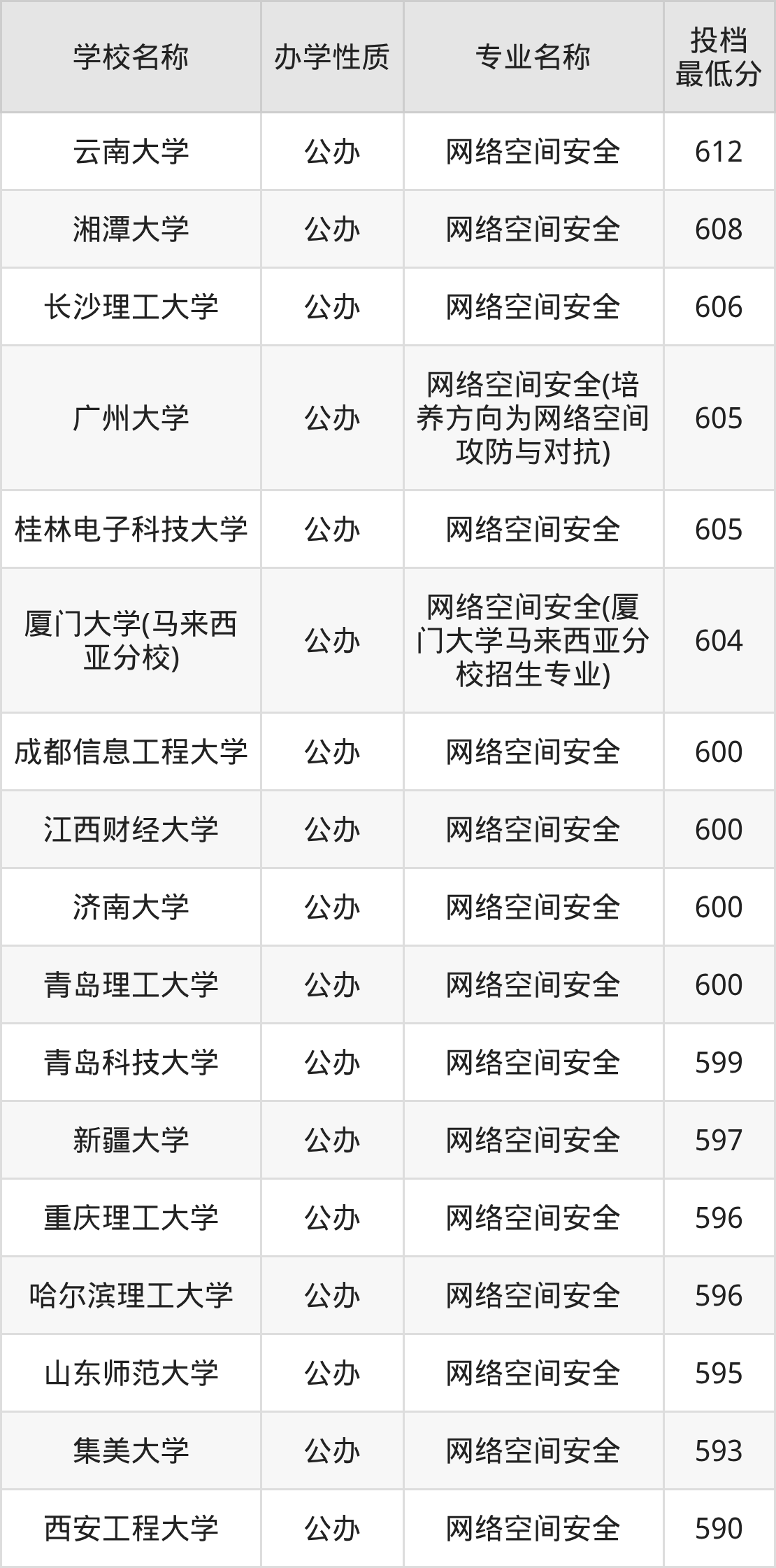二、全国网络空间安全录取分数线排名表