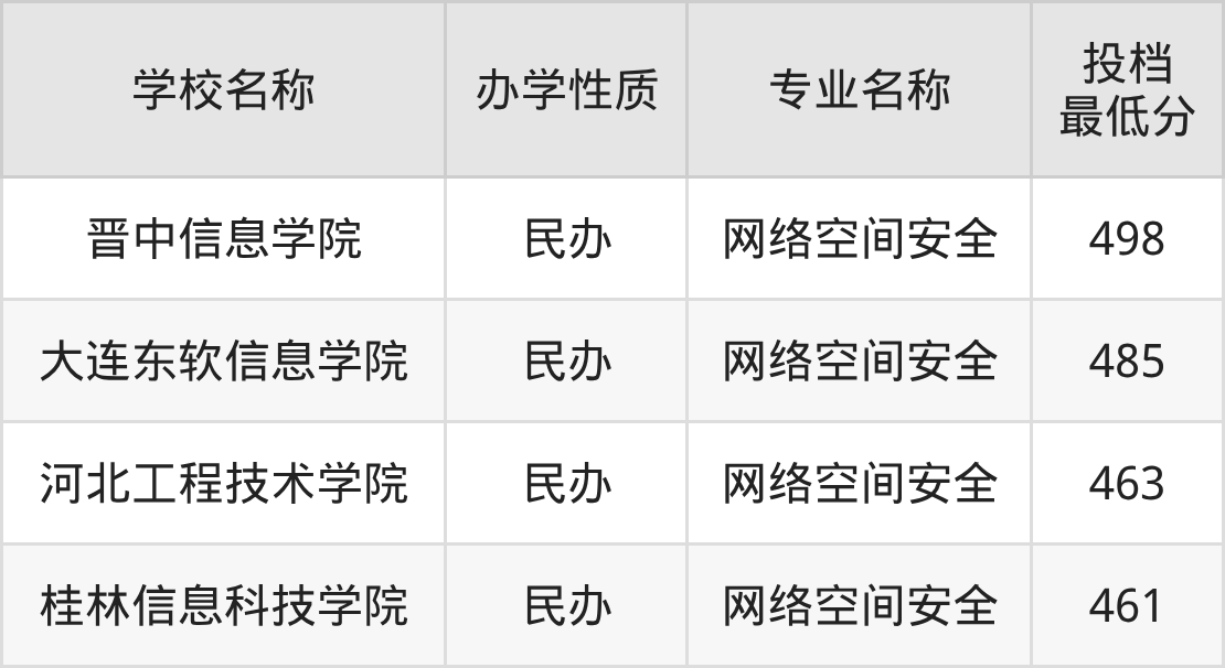 分数线最低、最好考的是桂林信息科技学院,学校网络空间安全最低分是461,超本科线2分,不过这所学校是民办性质。2025公办大学最低分是509,收分最低的学校是新疆政法学院,超本科线50分能上。