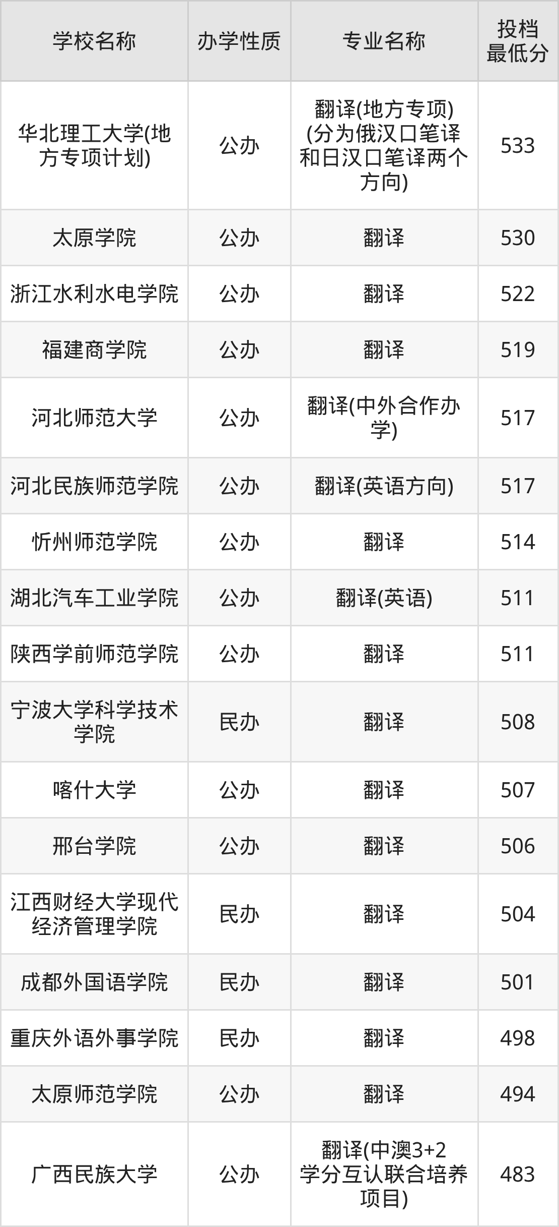 500分左右的翻译大学:成都外国语学院501分、江西财经大学现代经济管理学院504分、邢台学院506分、喀什大学507分、宁波大学科学技术学院508分等;