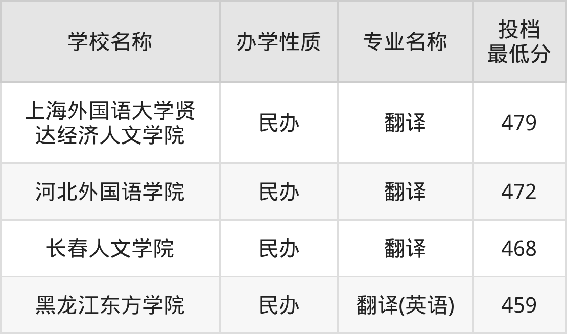 2025年翻译专业最低录取分数线是459分,刚好在本科分数线(459分)处。也就是说想报考翻译专业的同学,至少得达到本科线459分及以上。翻译专业最低分的大学是黑龙江东方学院,不过该校属于民办。