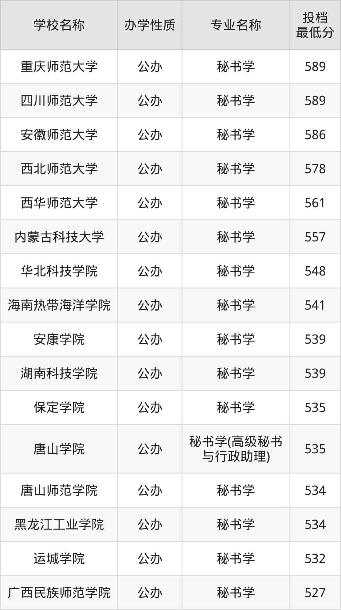 下面是2025年全国所有大学秘书学专业录取分数线一览表(按照分数线从高到低排名):