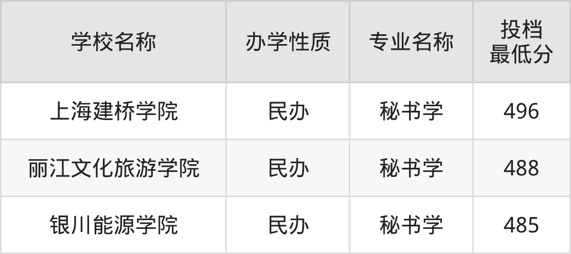 2025年秘书学专业最低录取分数线是485分,超本科分数线(477分)8分。也就是说想报考秘书学专业的同学,至少得超过本科线8分及以上。秘书学专业最低分的大学是银川能源学院,不过该校属于民办。