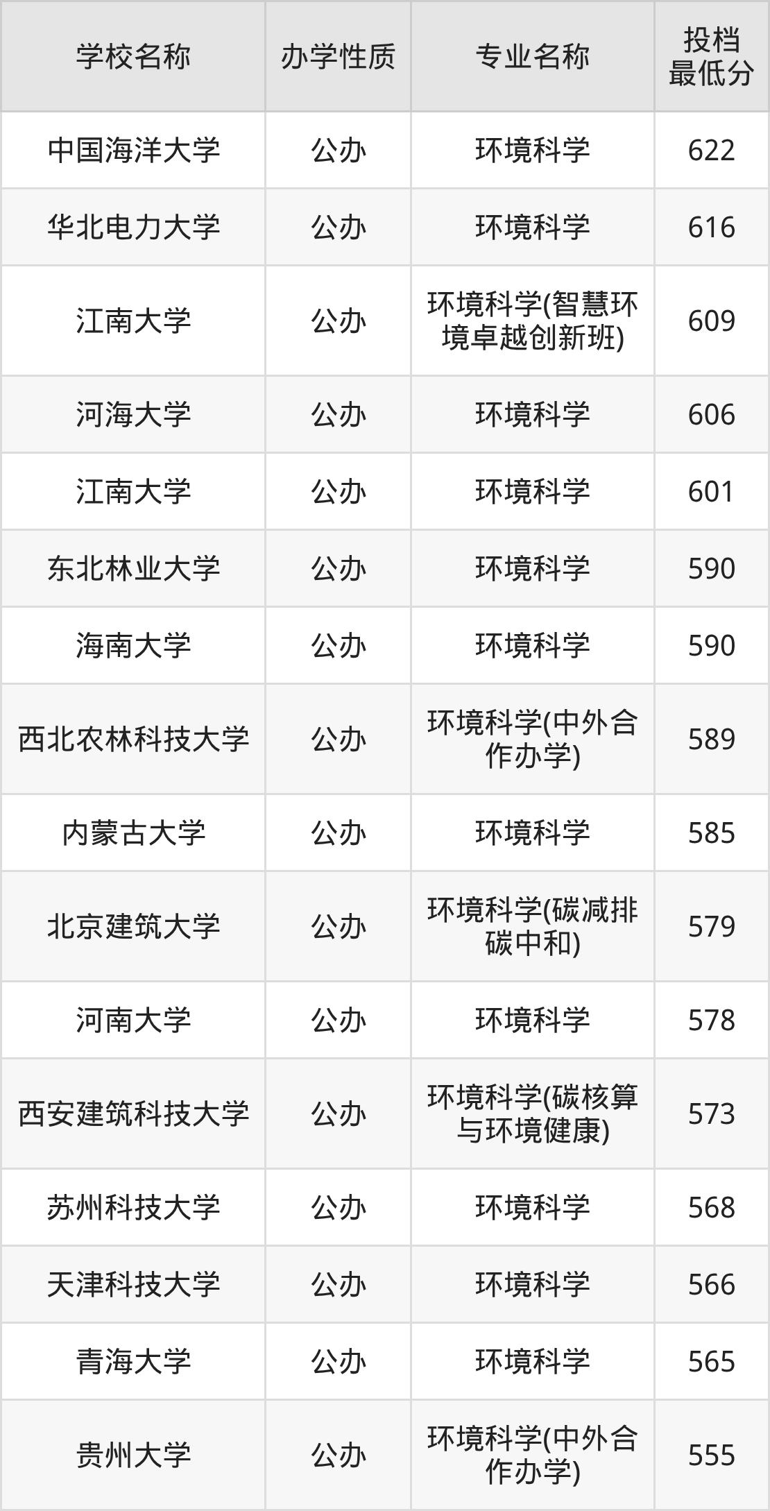 600分左右的环境科学大学:江南大学601分、河海大学606分、江南大学609分(智慧环境卓越创新班)、华北电力大学616分、中国海洋大学622分等;