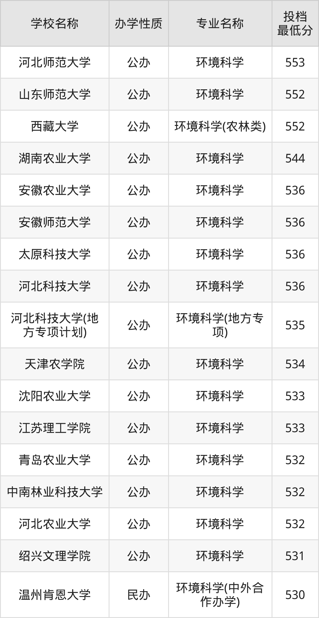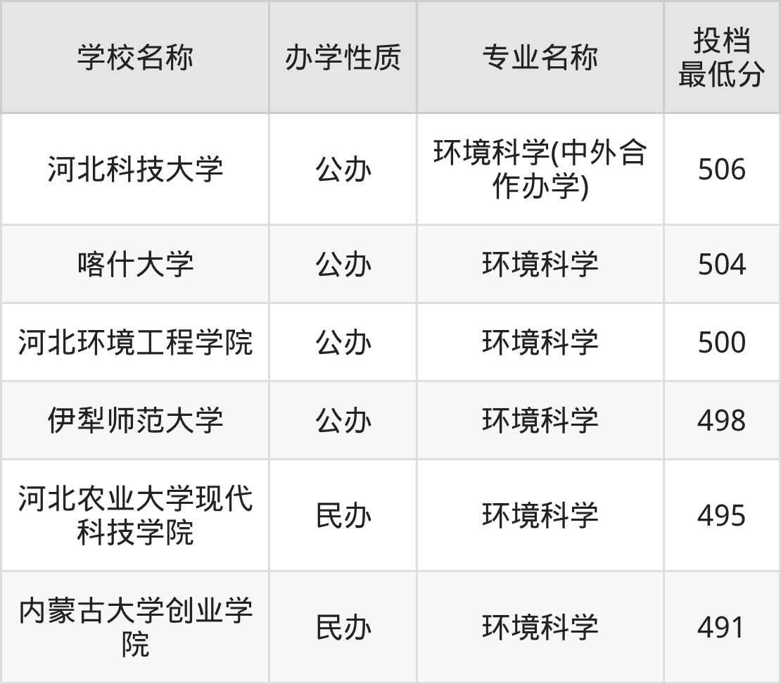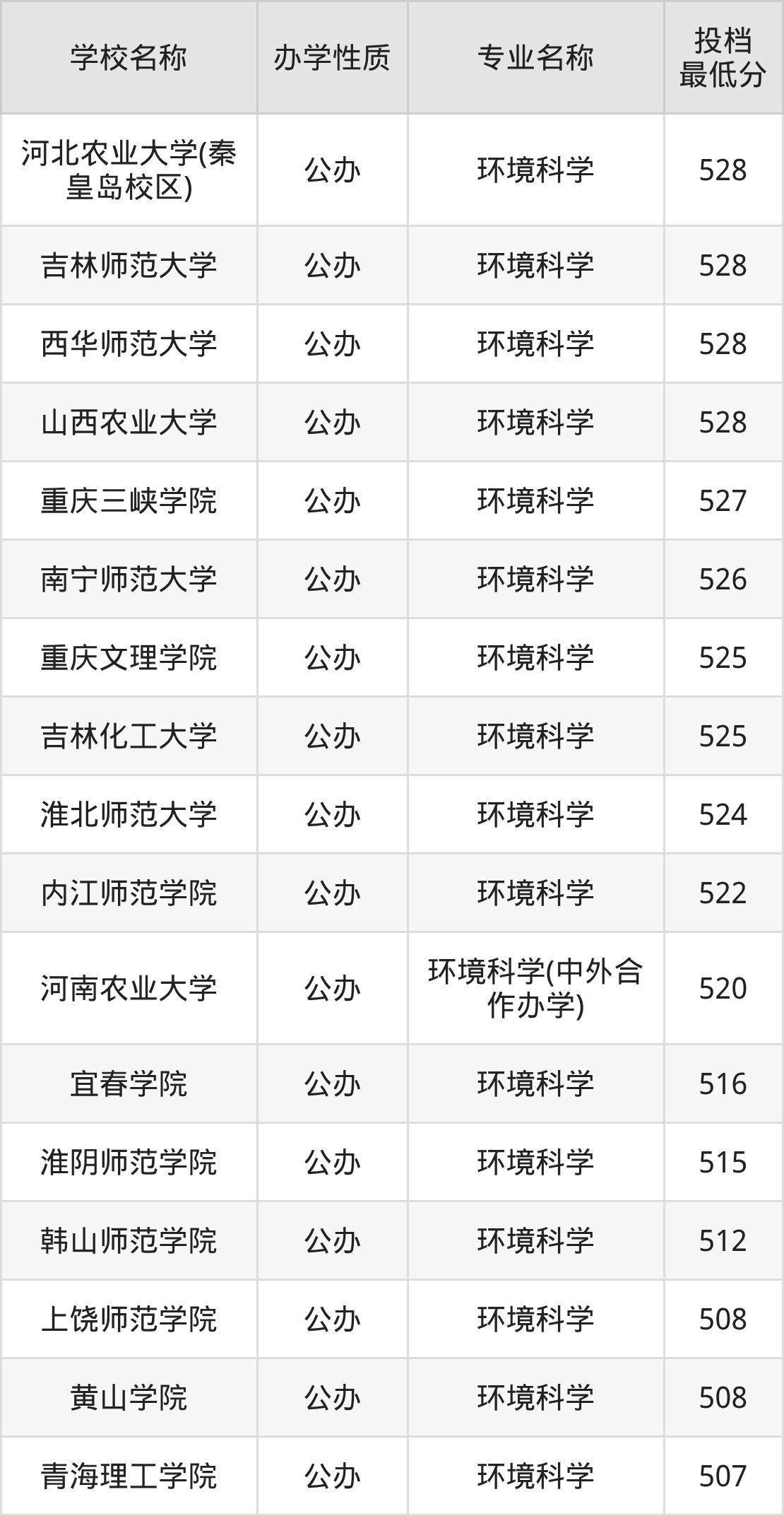 500分左右的环境科学大学:喀什大学504分、河北科技大学506分(中外合作办学)、青海理工学院507分、黄山学院508分、上饶师范学院508分等;