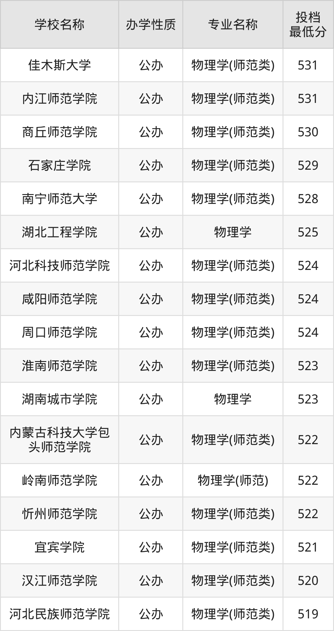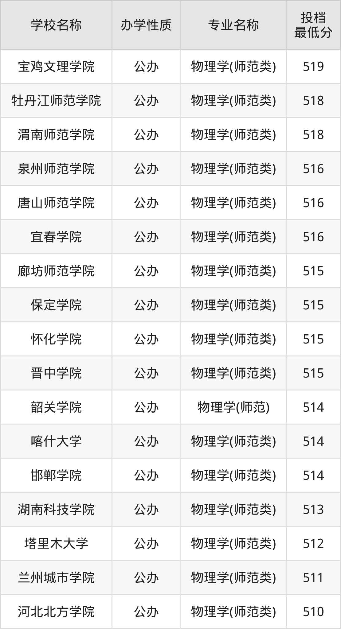 500分左右的物理学大学有:汉江师范学院520分、宝鸡文理学院519分、河北民族师范学院519分、牡丹江师范学院518分、渭南师范学院518分。