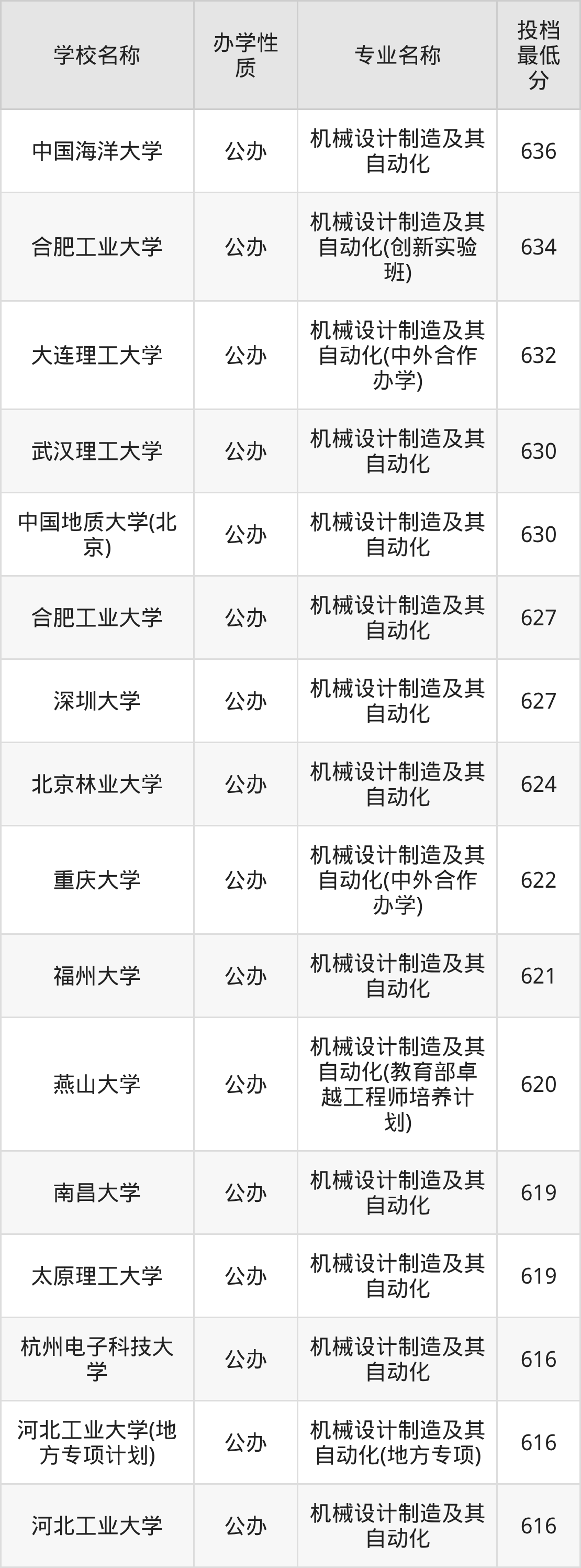 机械设计制造及其自动化专业最好的50所大学名单如表中所示,考生可以结合上文整理的分数线,然后根据自己的成绩选择合适的学校报考。