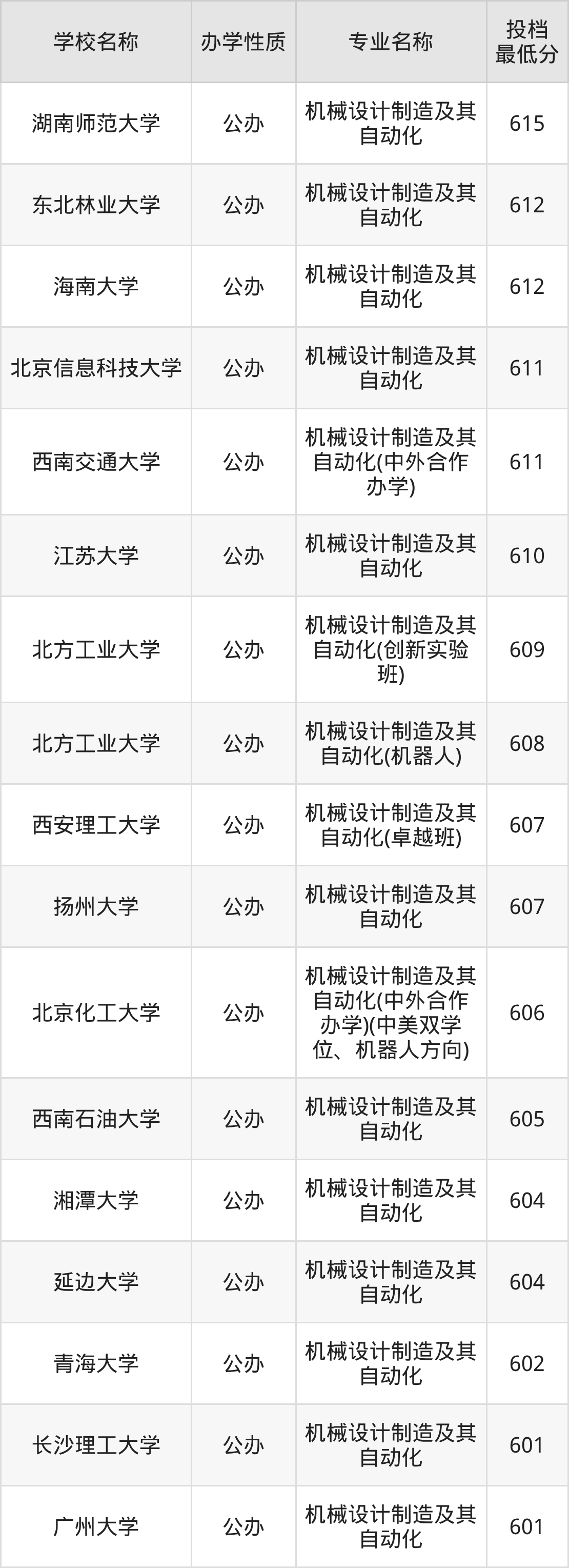 600分左右的机械设计制造及其自动化大学:山东科技大学601分、广州大学601分、长沙理工大学601分、青海大学602分、延边大学604分等;