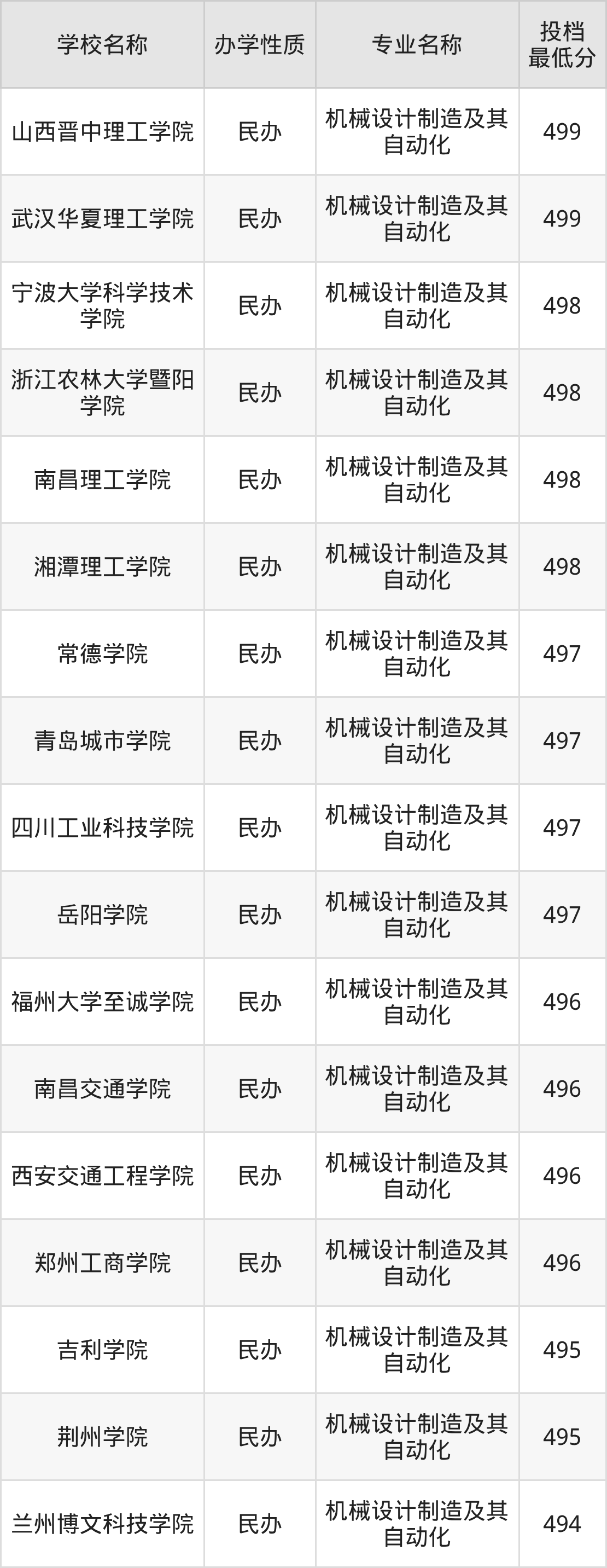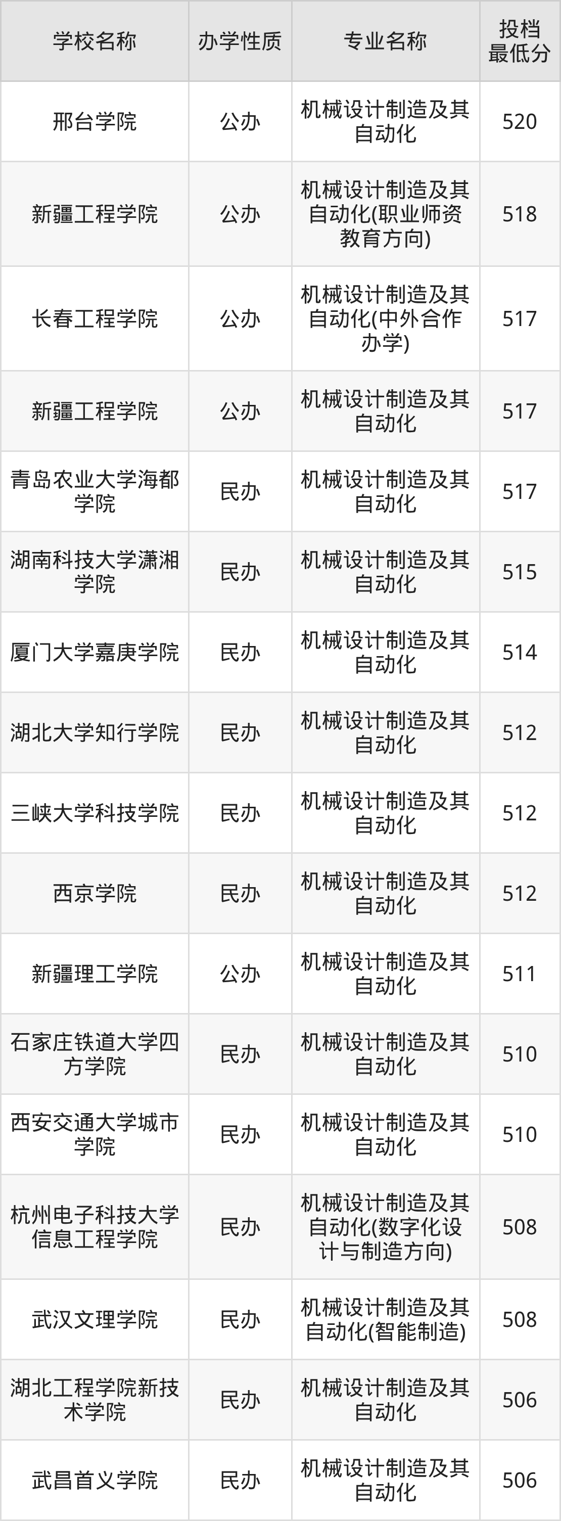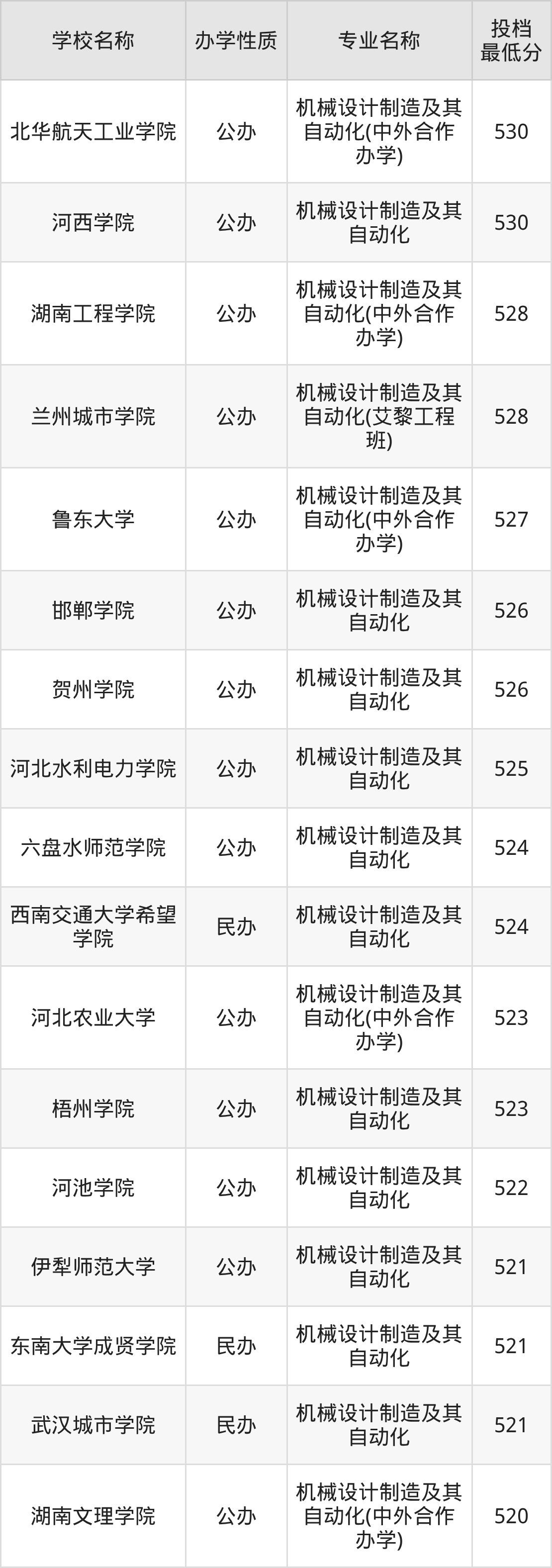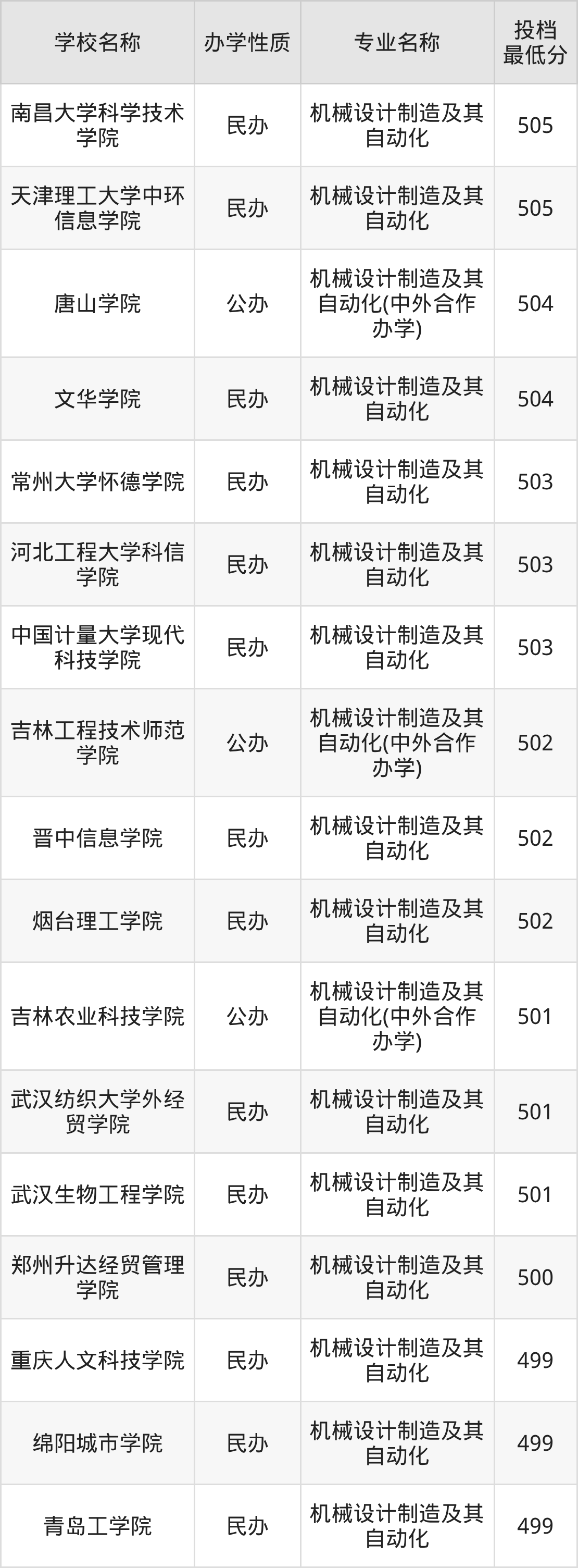 500分左右的机械设计制造及其自动化大学:武汉生物工程学院501分、武汉纺织大学外经贸学院501分、吉林农业科技学院501分(中外合作办学)、烟台理工学院502分、晋中信息学院502分等;
