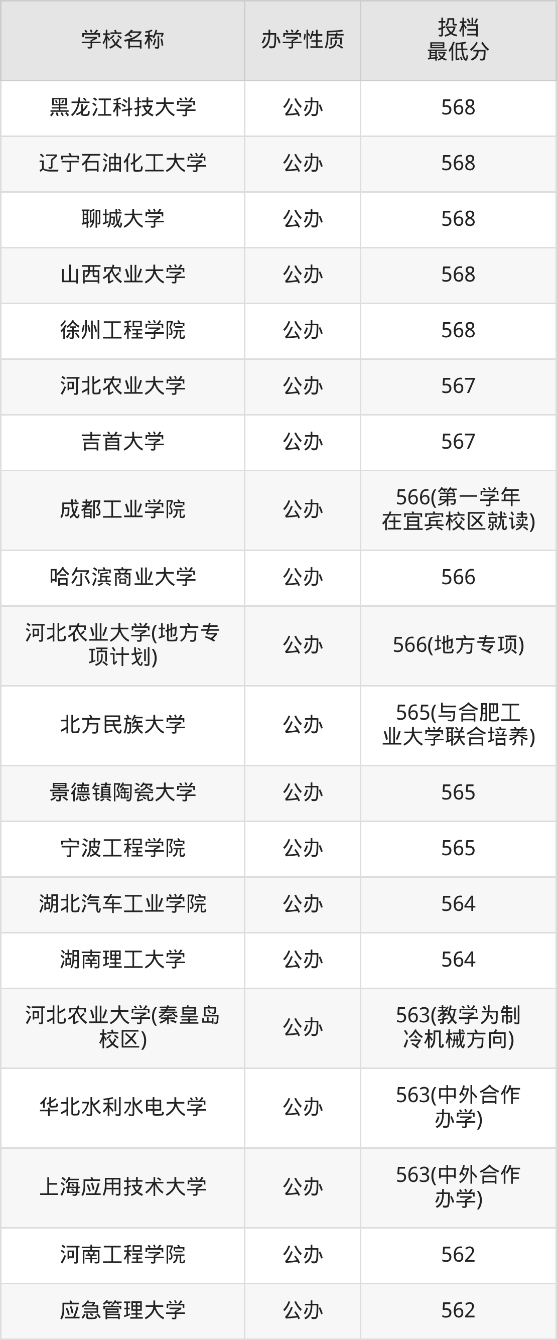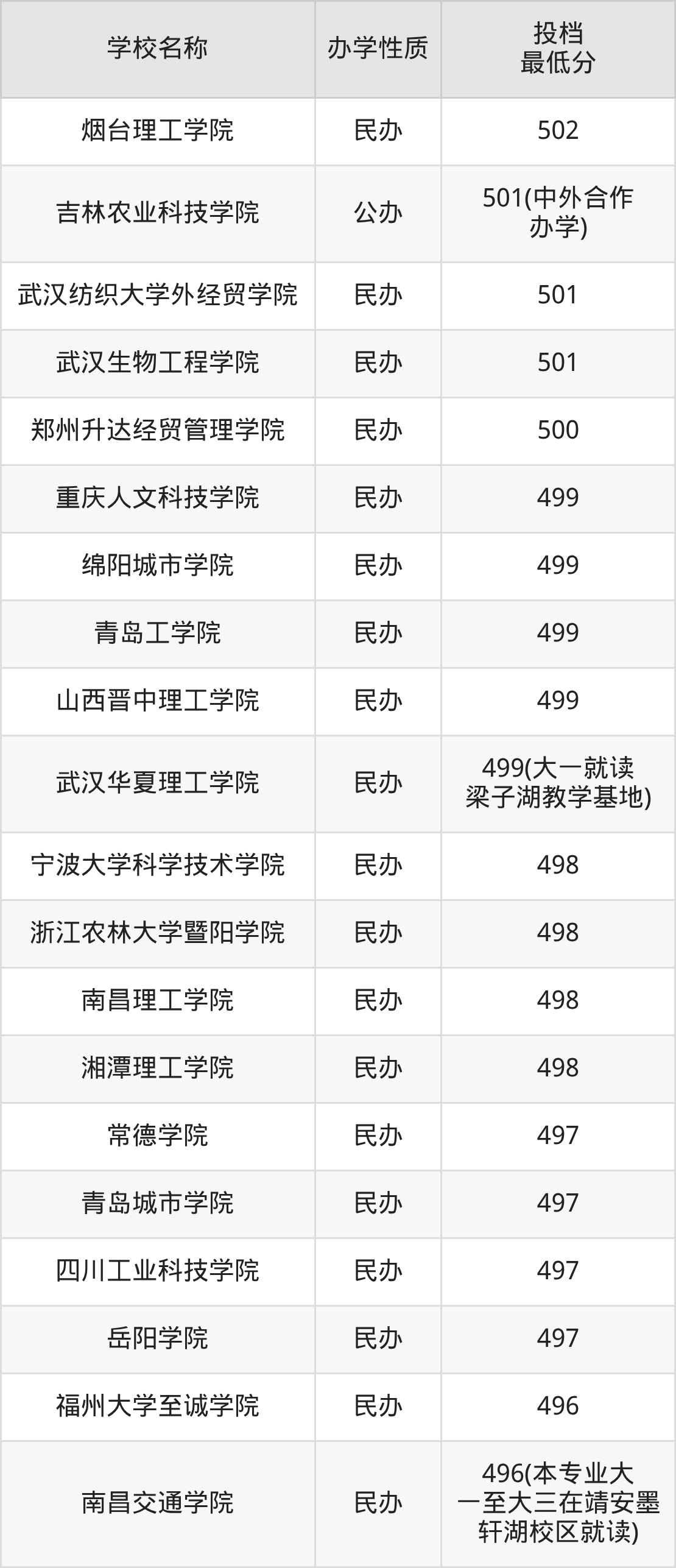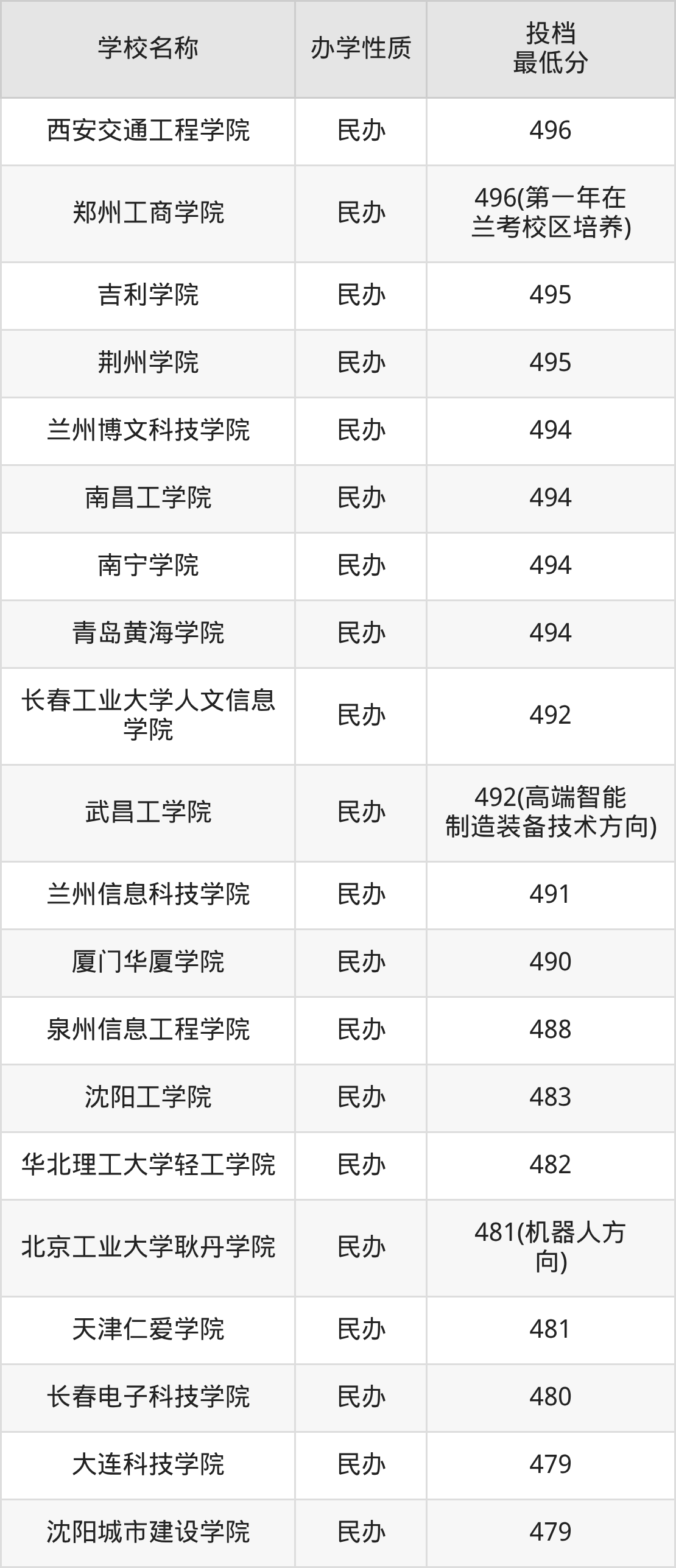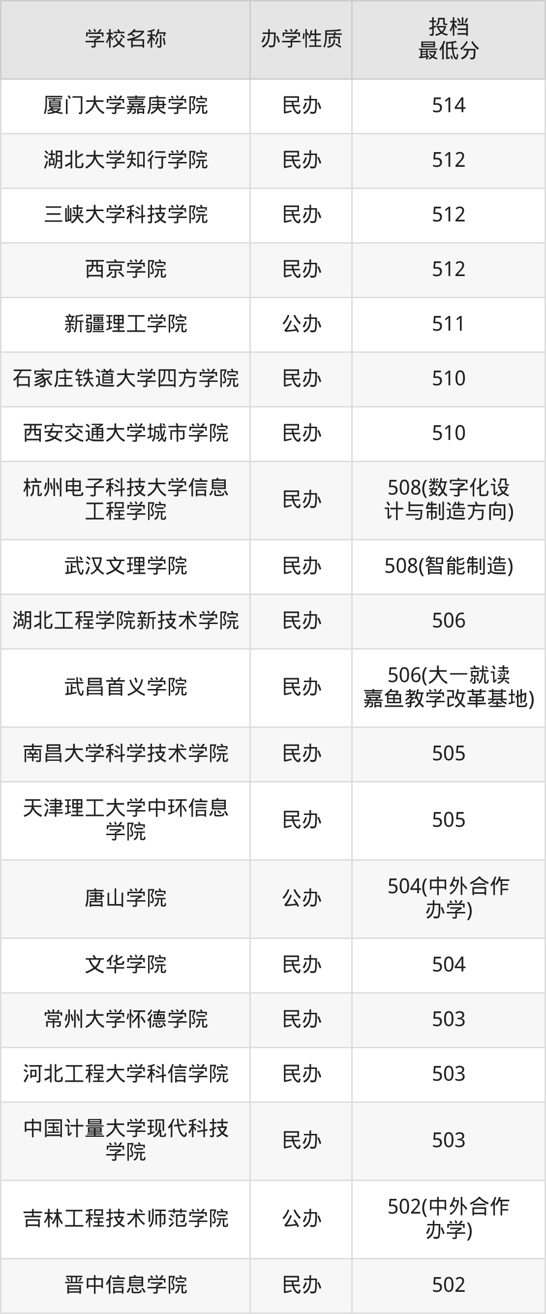500分左右的机械设计制造及其自动化大学:郑州升达经贸管理学院500分、吉林农业科技学院501分(中外合作办学)、武汉纺织大学外经贸学院501分、武汉生物工程学院501分、吉林工程技术师范学院502分(中外合作办学)等;