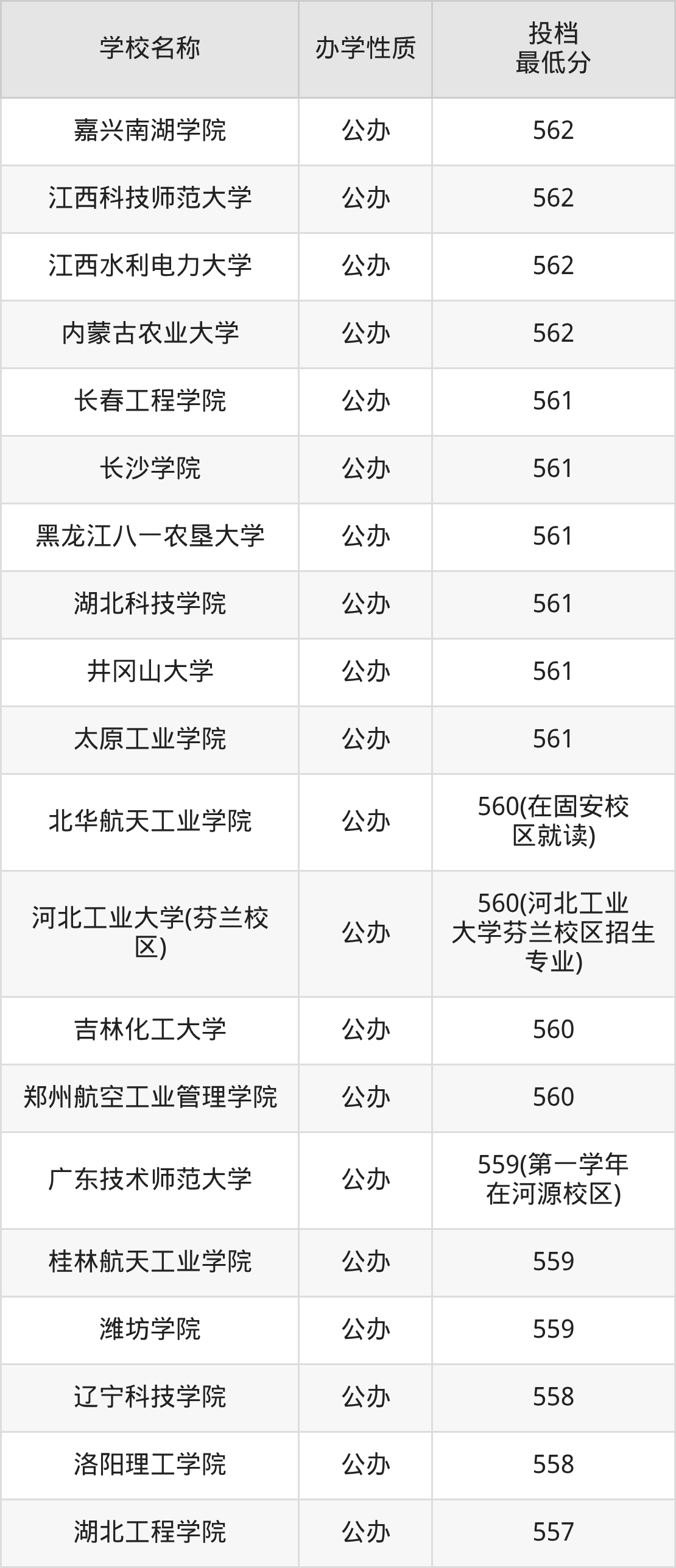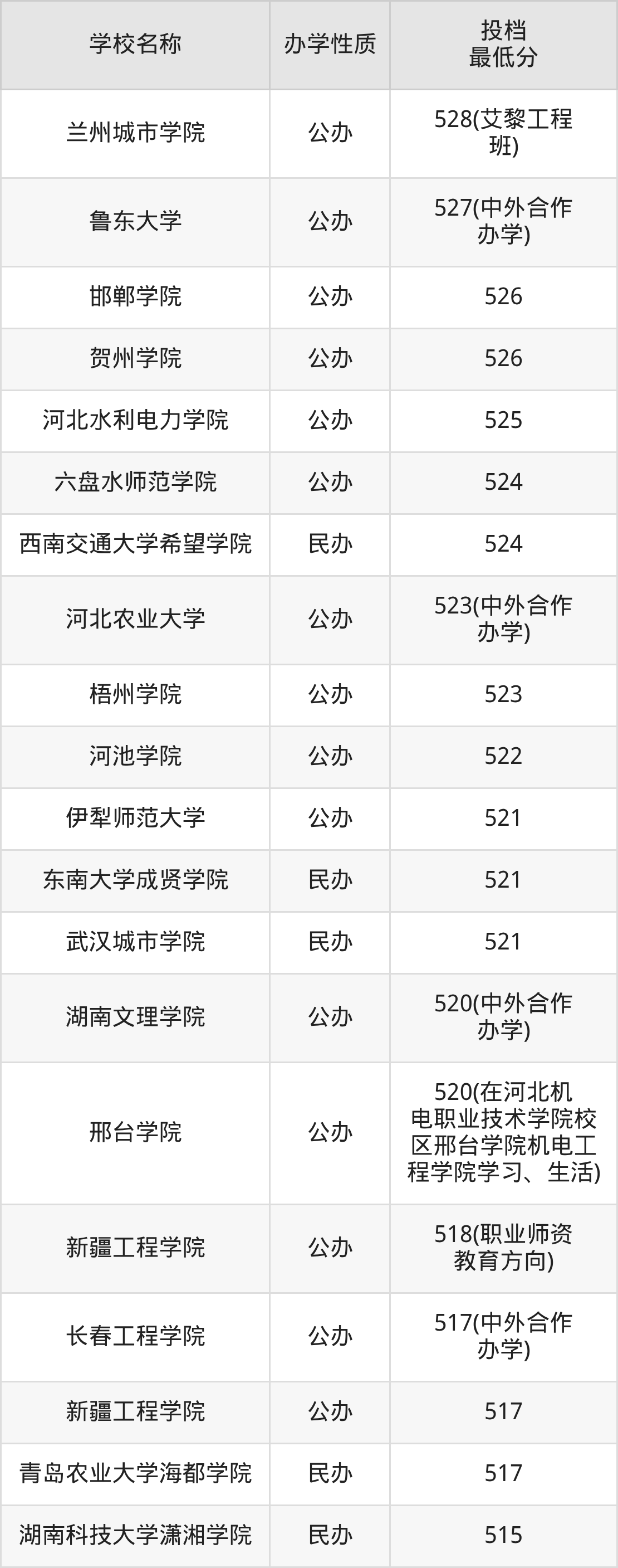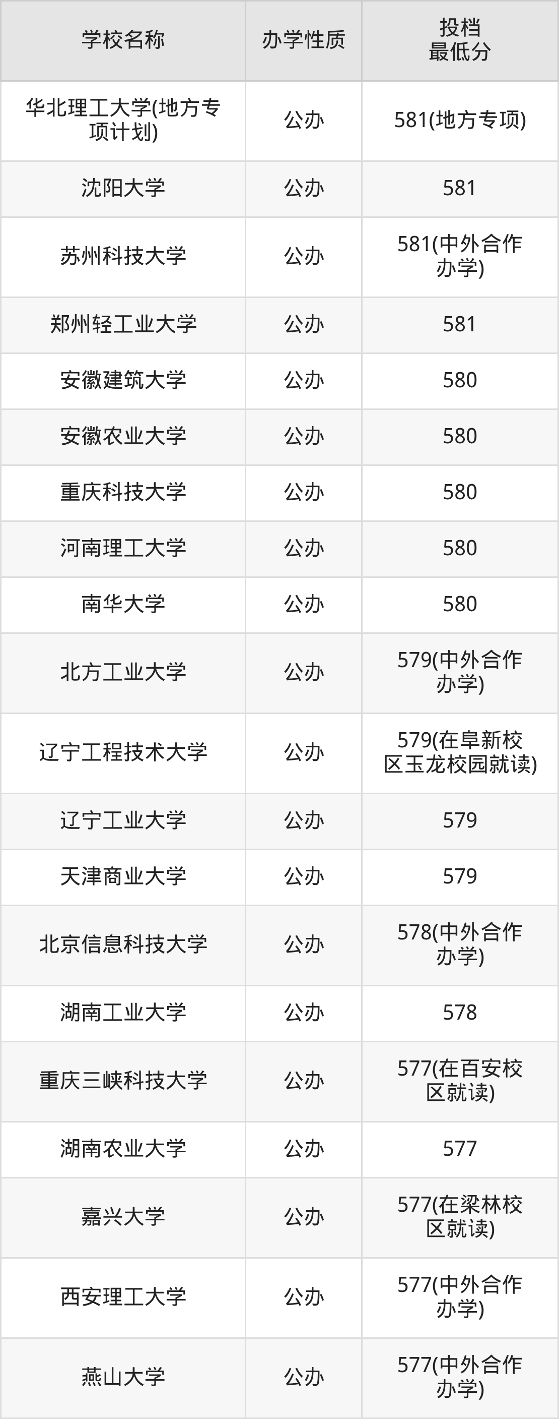 500分左右的机械设计制造及其自动化大学:郑州升达经贸管理学院500分、吉林农业科技学院501分(中外合作办学)、武汉纺织大学外经贸学院501分、武汉生物工程学院501分、吉林工程技术师范学院502分(中外合作办学)等;