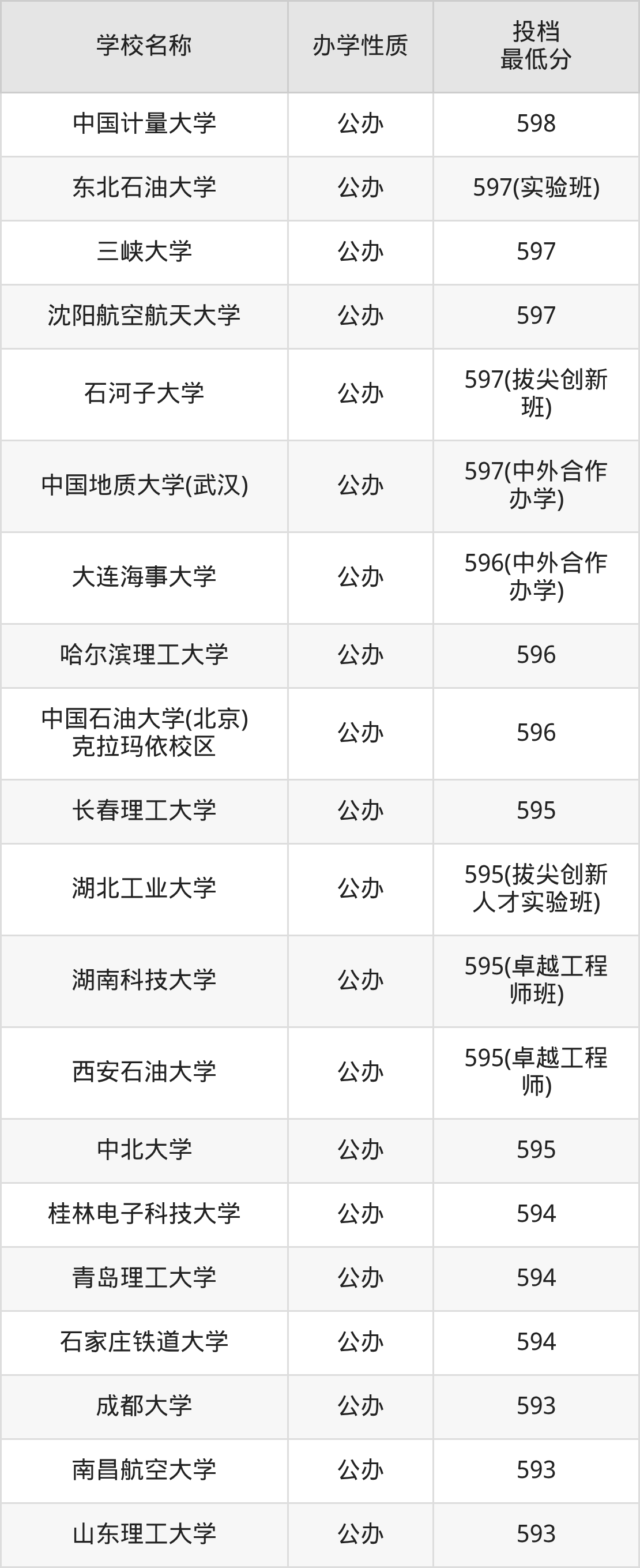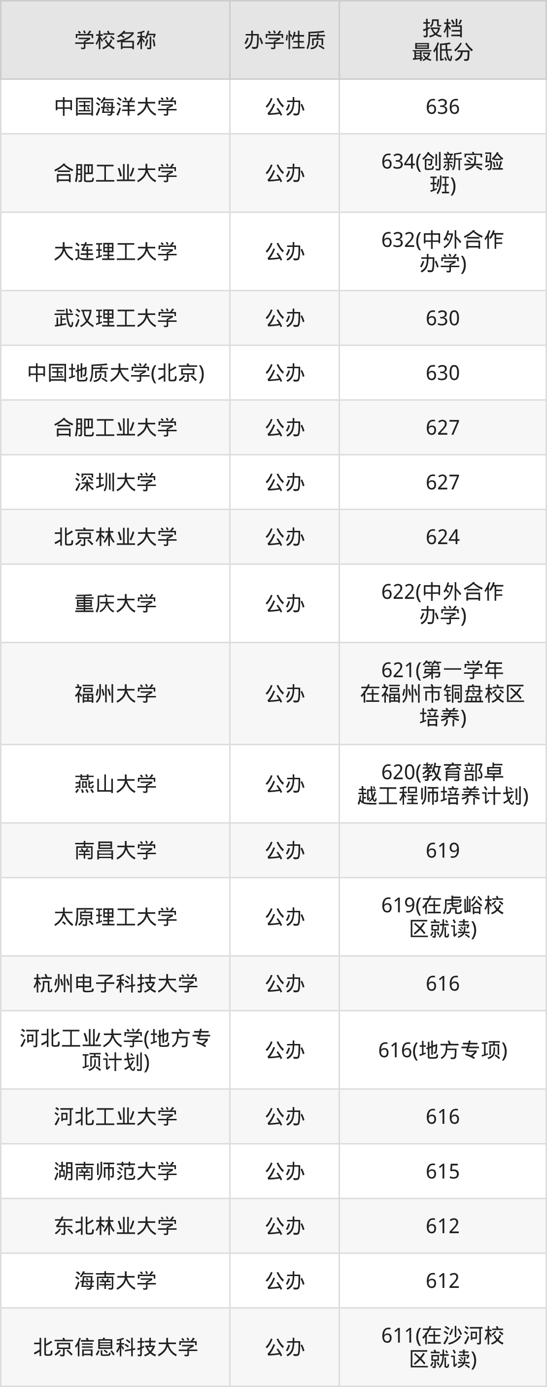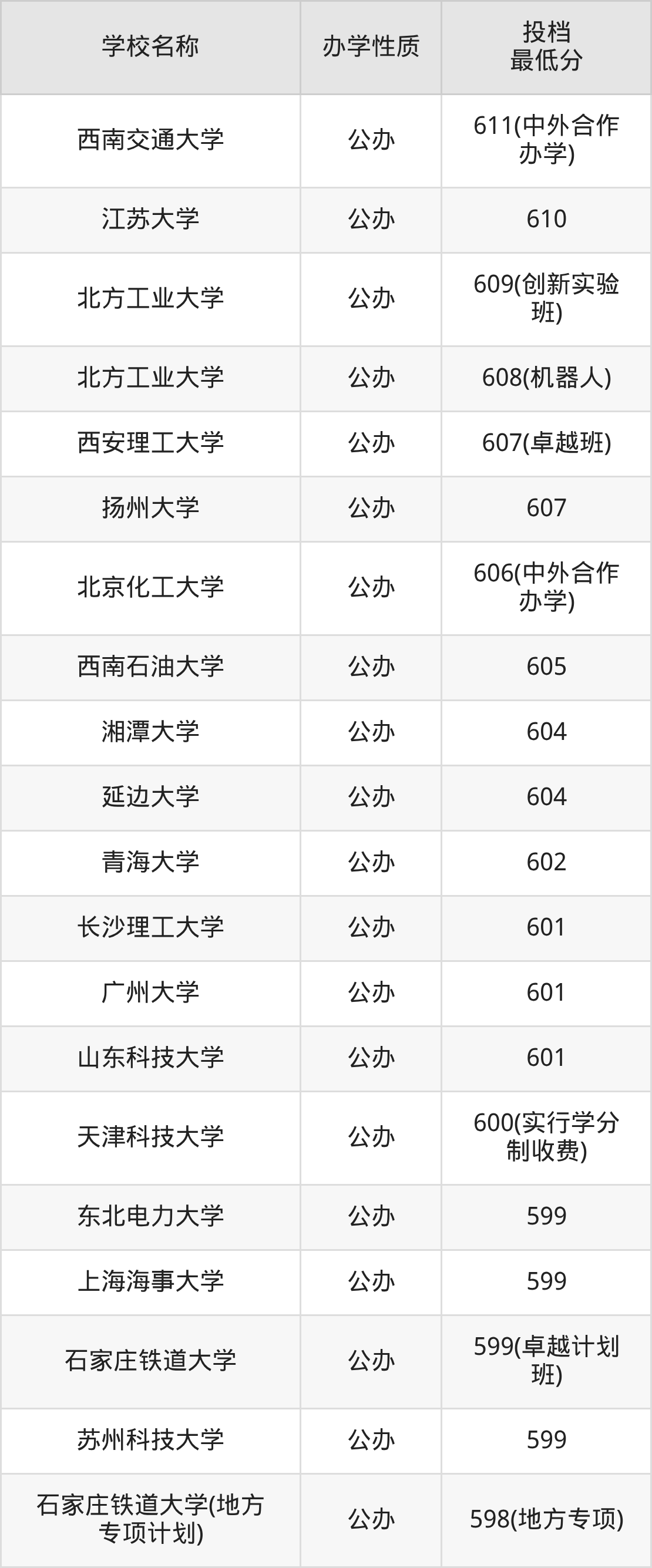 600分左右的机械设计制造及其自动化大学:天津科技大学600分、长沙理工大学601分、广州大学601分、山东科技大学601分、青海大学602分等;