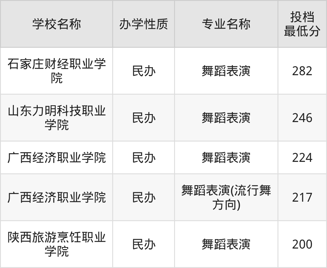 舞蹈表演专业收分最高的大学是石家庄财经职业学院,2025年最低分282分,超专科线82分。分数线排名前五的大学还有:山东力明科技职业学院246分、广西经济职业学院224分、广西经济职业学院(流行舞方向)217分、陕西旅游烹饪职业学院200分。