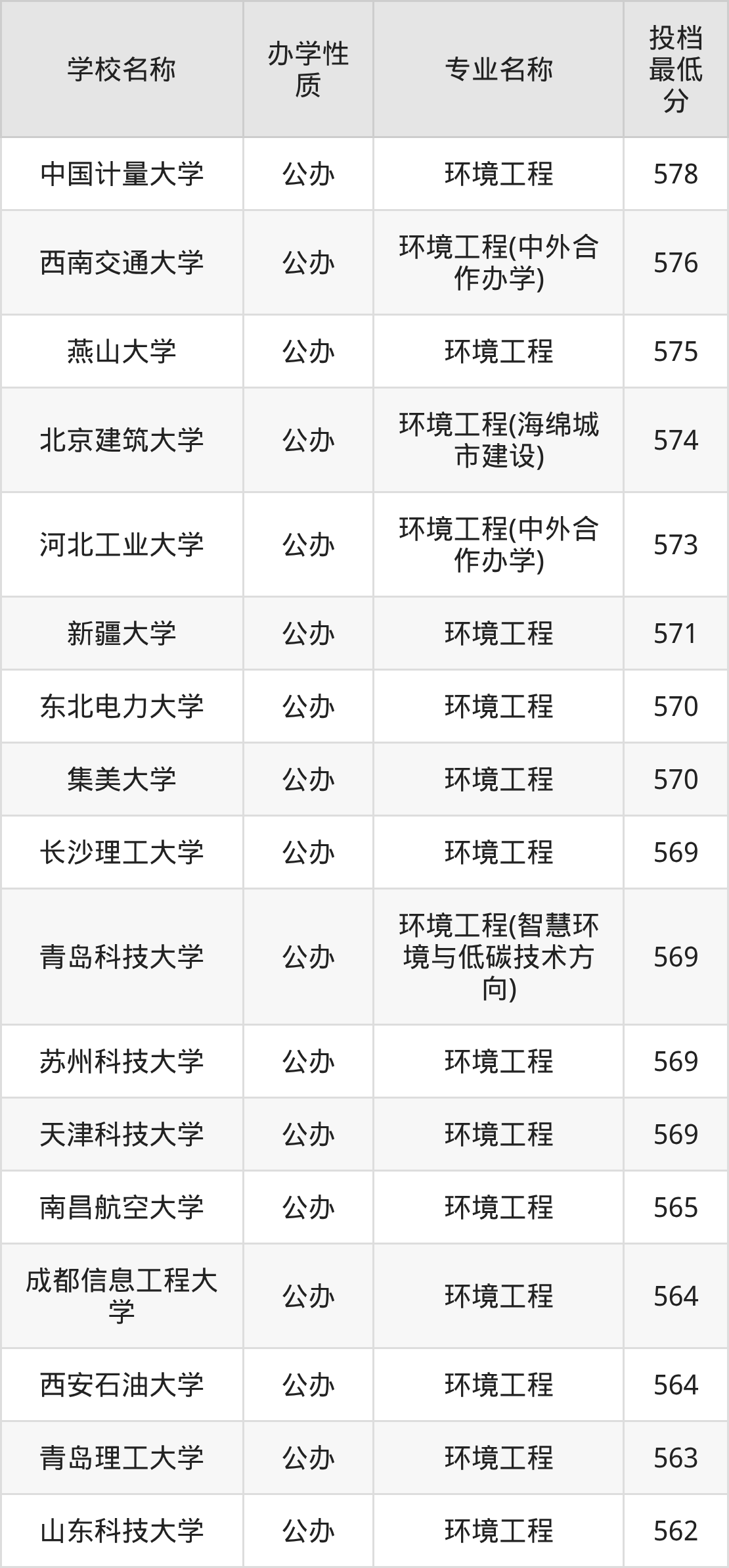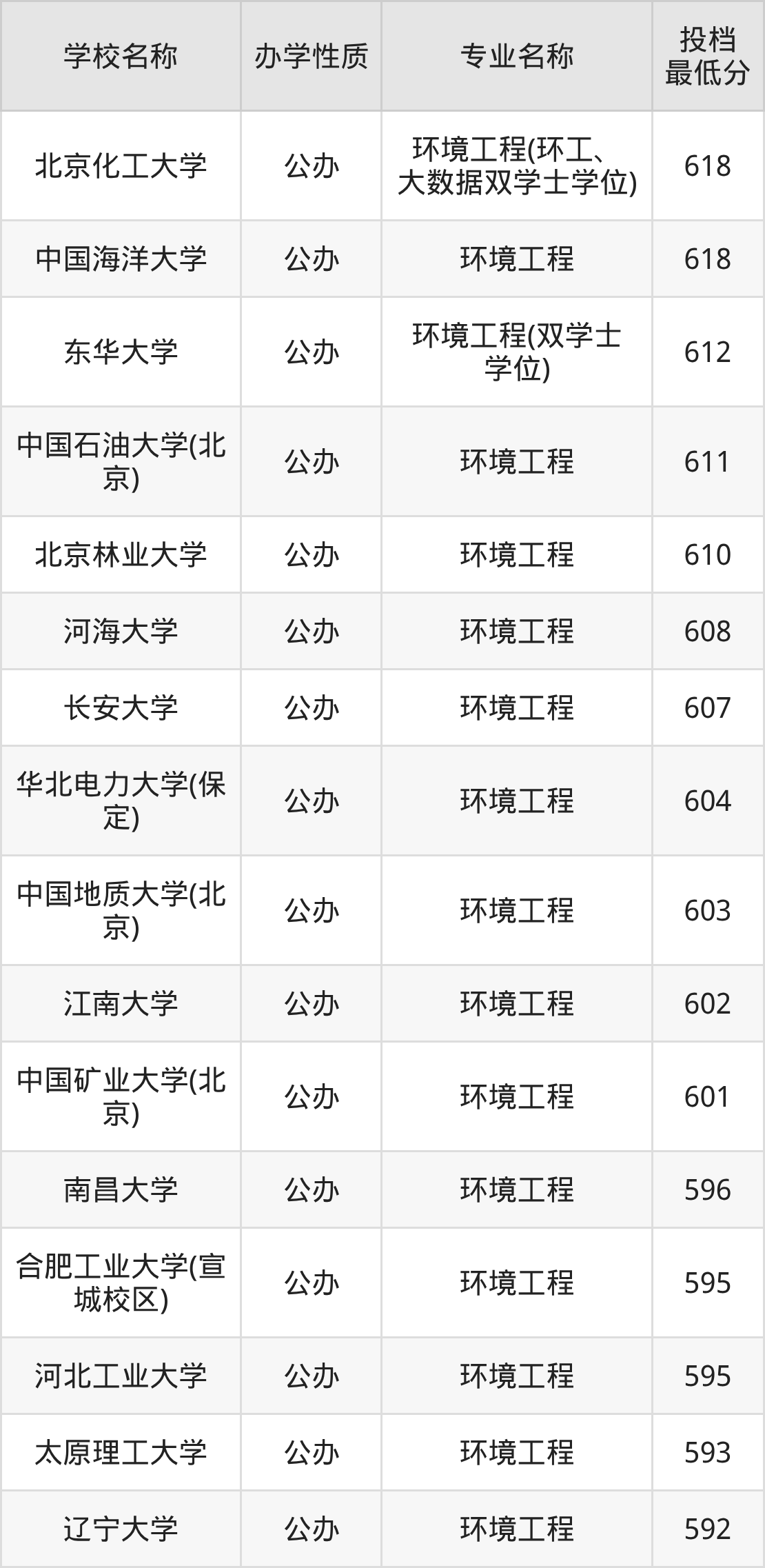 600分左右的环境工程大学:中国矿业大学(北京)601分、江南大学602分、中国地质大学(北京)603分、华北电力大学(保定)604分、长安大学607分等;