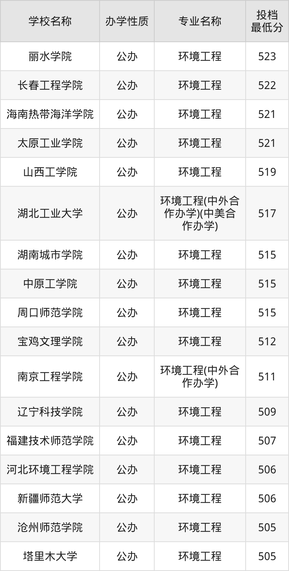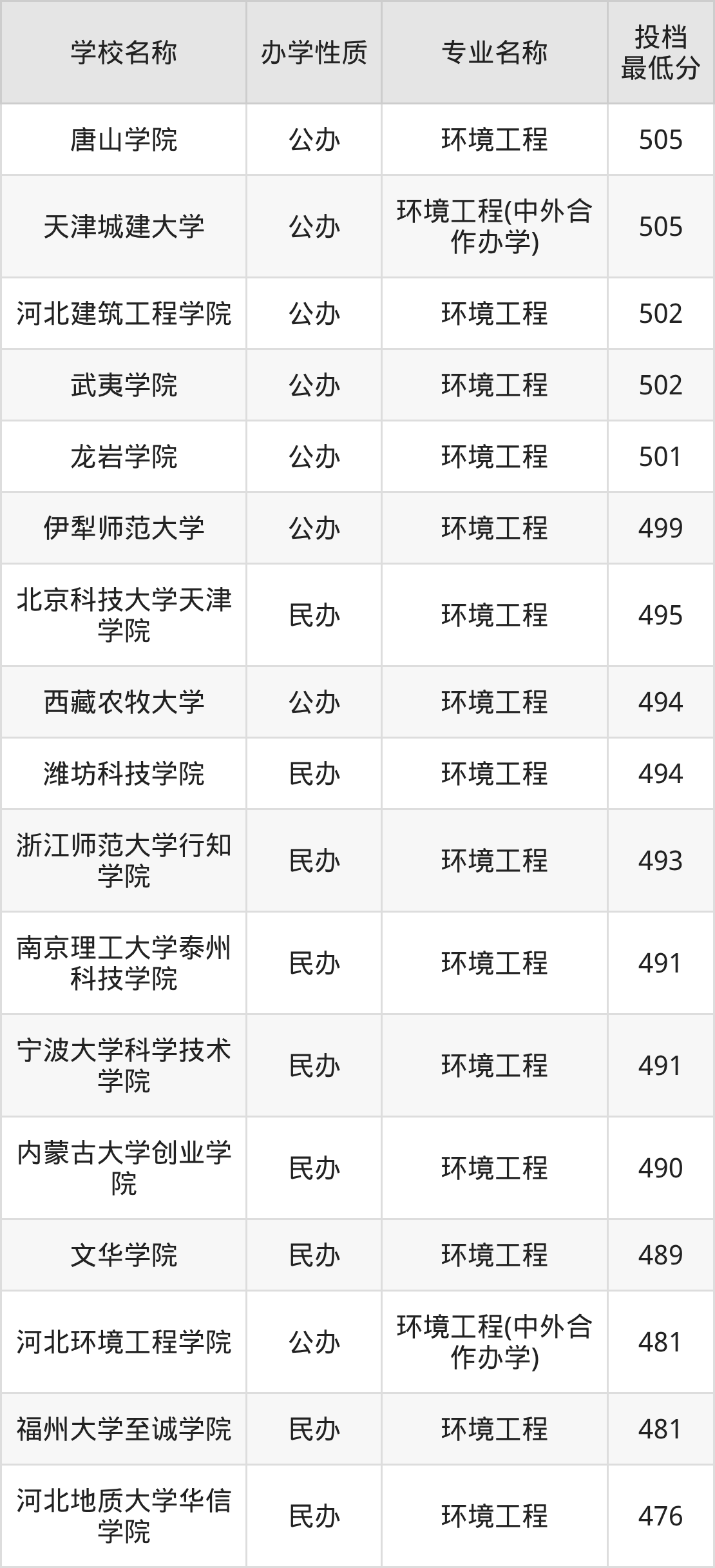 500分左右的环境工程大学:龙岩学院501分、武夷学院502分、河北建筑工程学院502分、天津城建大学505分(中外合作办学)、唐山学院505分等;