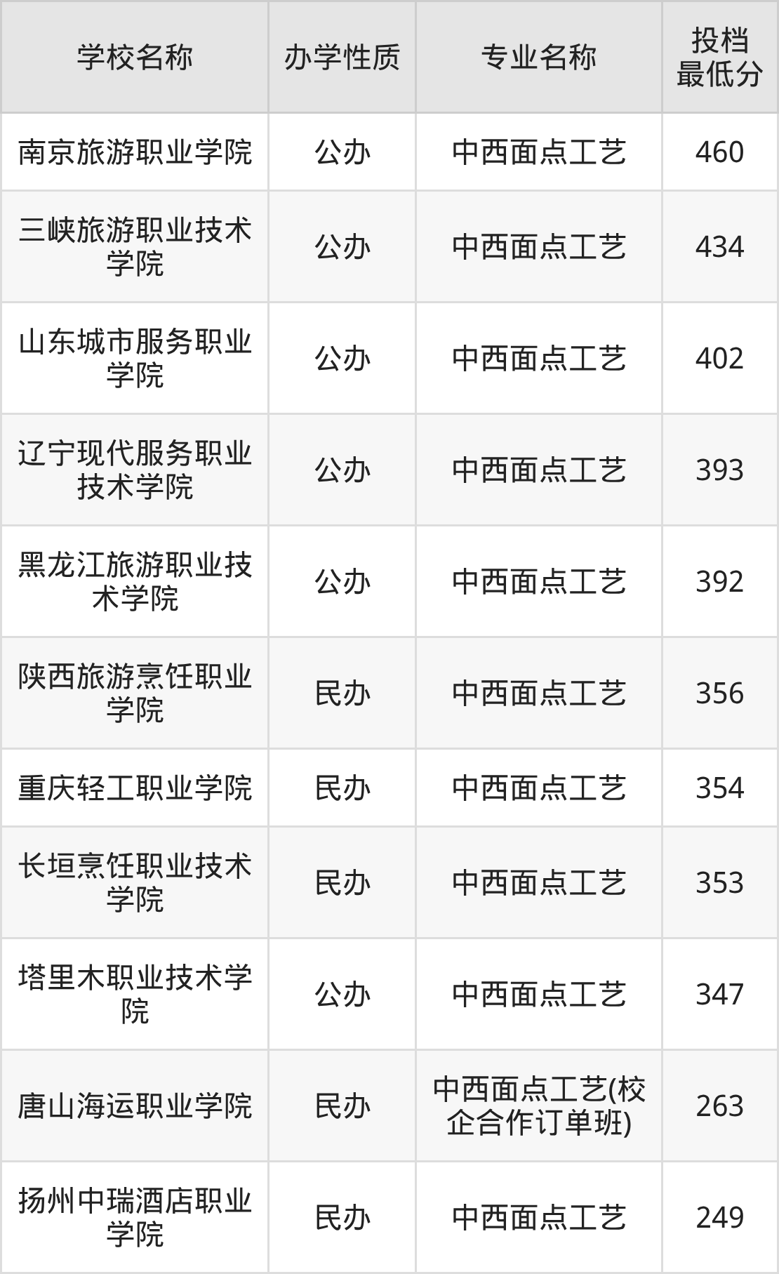 下面是全国各个大学中西面点工艺专业最低录取分数线排名一览表,考生可根据自己的分数情况选择合适的学校报考。