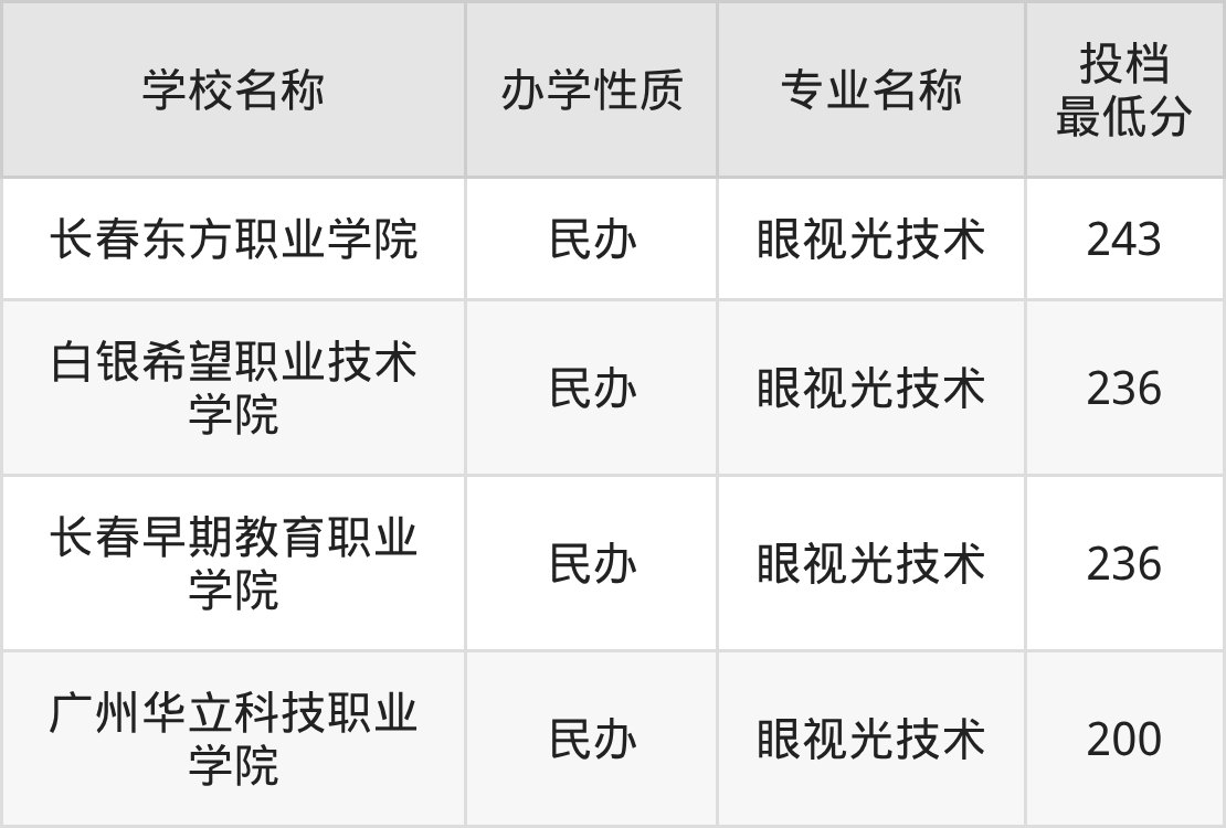 250分左右的眼视光技术大学有:长春东方职业学院243分、白银希望职业技术学院236分、长春早期教育职业学院236分。