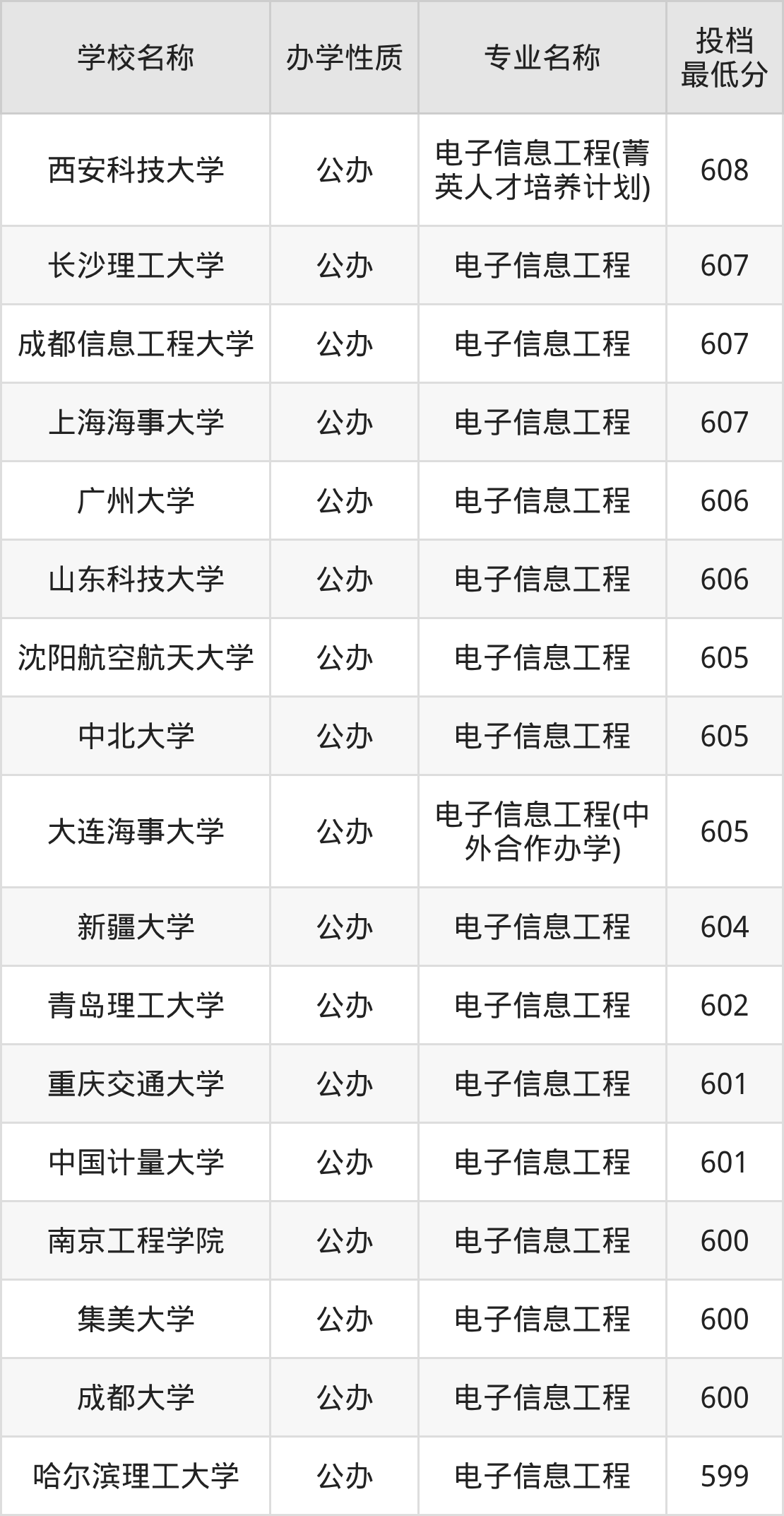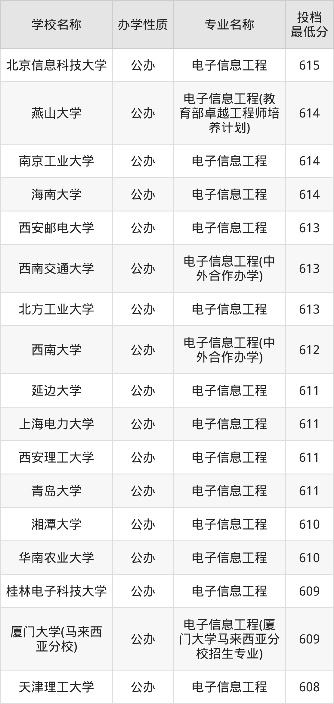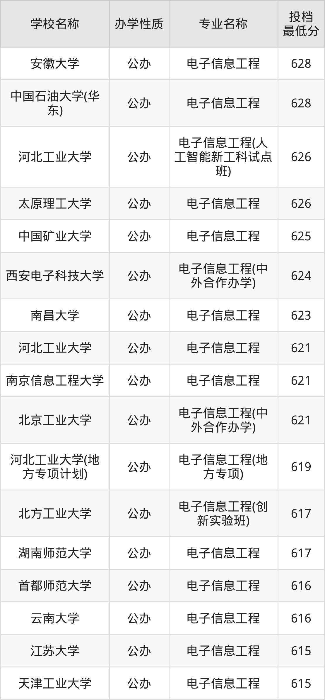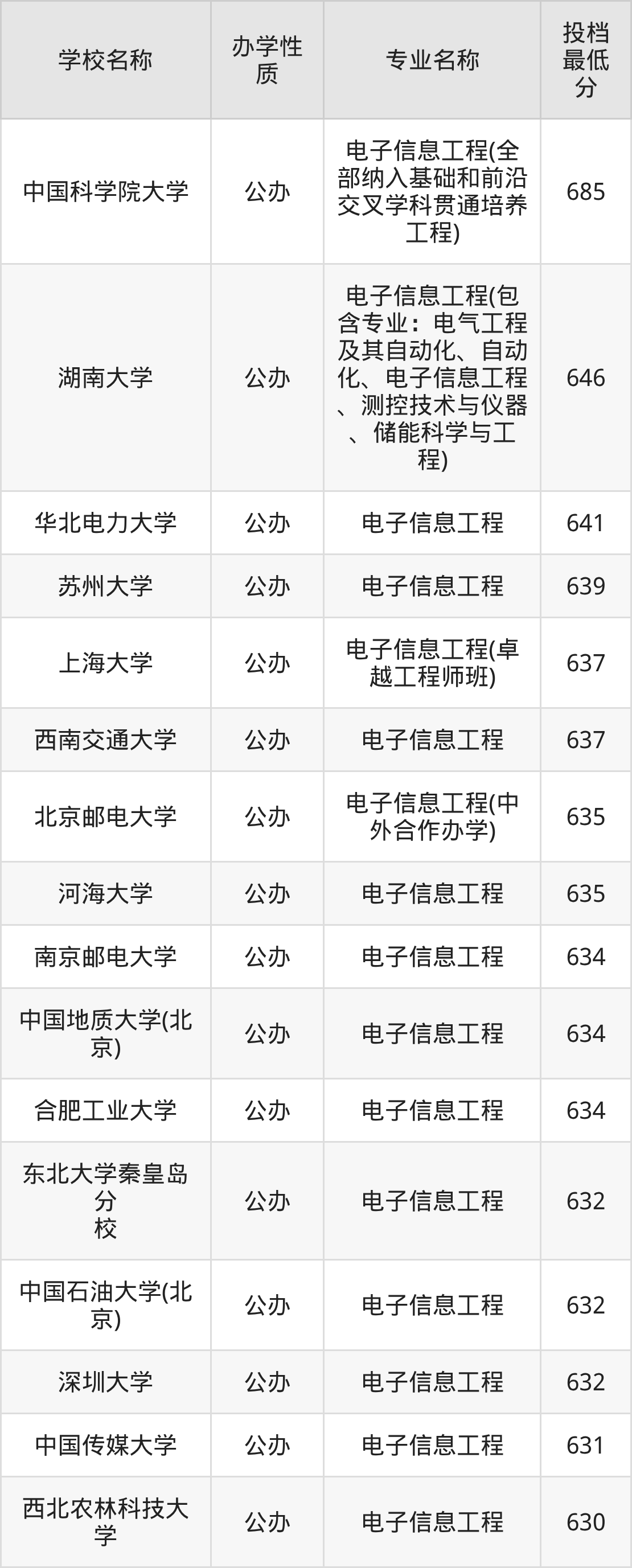 下面是全国各个大学电子信息工程专业最低录取分数线排名一览表,考生可根据自己的分数情况选择合适的学校报考。