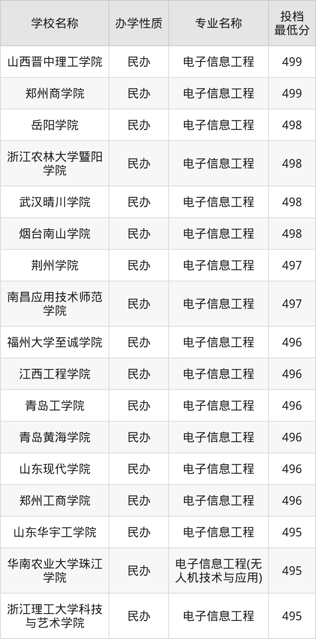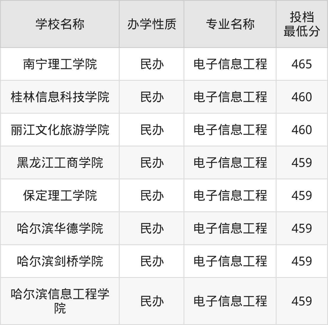 分数线最低、最好考的是黑龙江工商学院,学校电子信息工程最低分是459,超本科线0分,不过这所学校是民办性质。2025公办大学最低分是470,收分最低的学校是广西民族大学,超本科线11分能上。