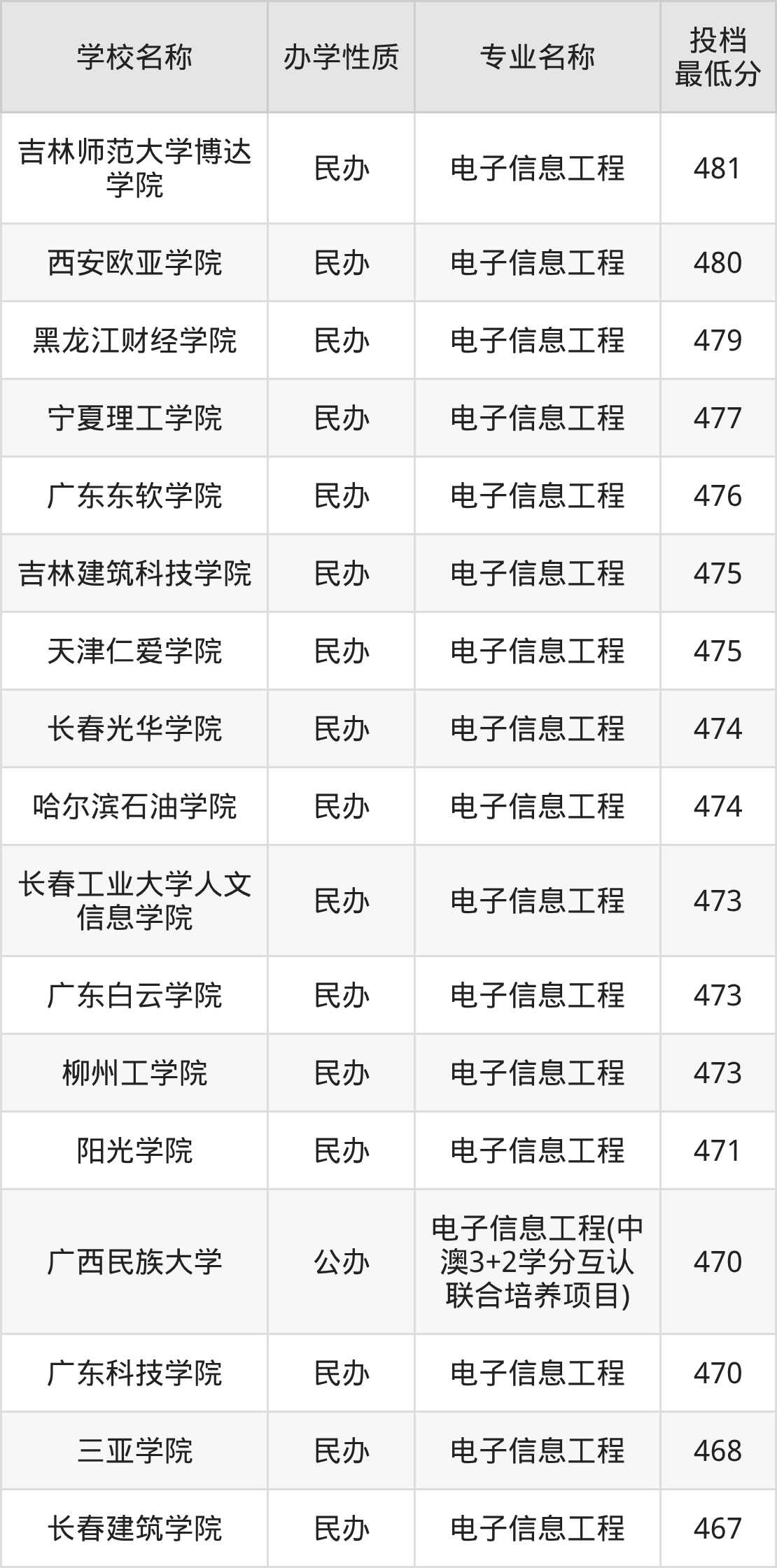 450分左右的电子信息工程大学有:广西民族大学470分、广东科技学院470分、三亚学院468分、长春建筑学院467分、南宁理工学院465分。