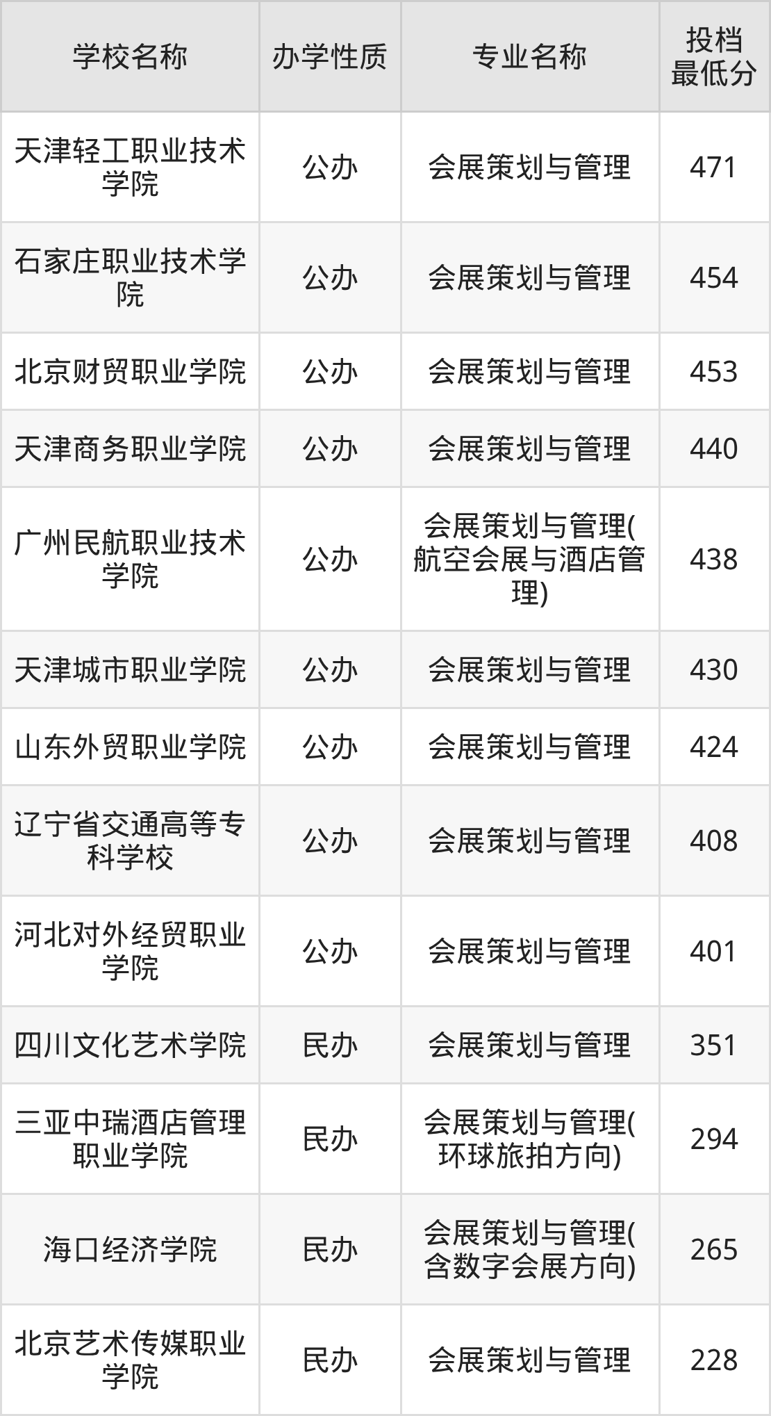 下面是全国各个大学会展策划与管理专业最低录取分数线排名一览表,考生可根据自己的分数情况选择合适的学校报考。